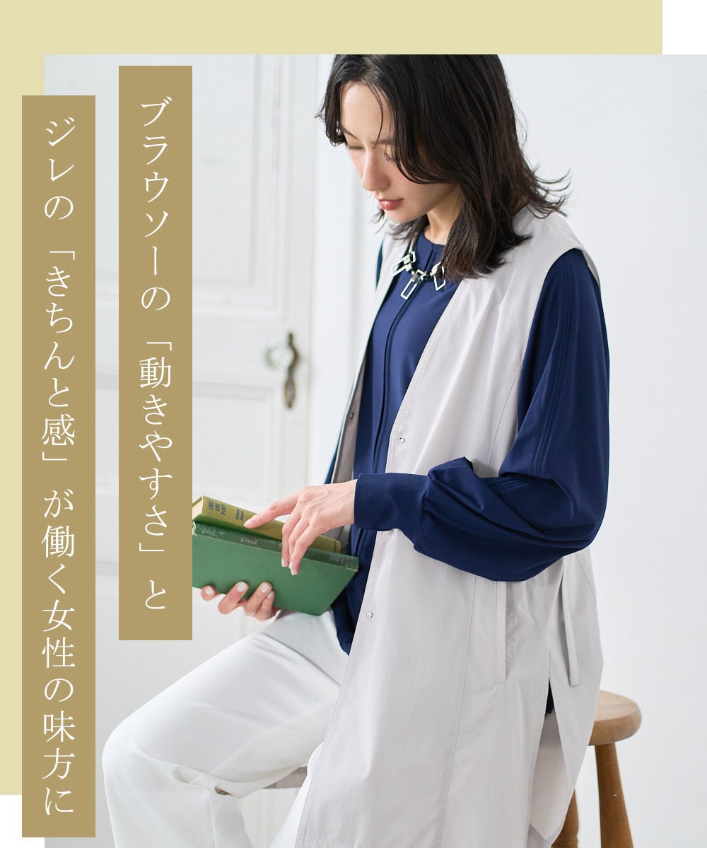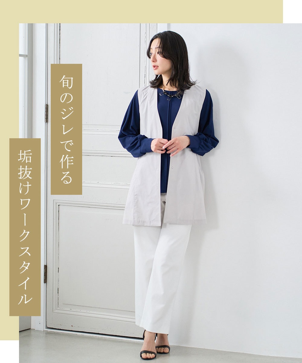 ライトグレーのジレを羽織るだけで、いつものブラウス×パンツが格段にブラッシュアップ。