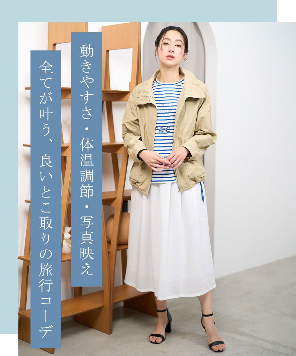シアースカートでトレンド感と女性らしさをプラスしたこなれ感たっぷりの旅行コーデです。