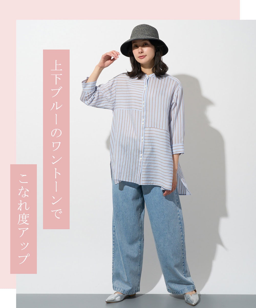 爽やかなブルーのワントーンに、黒のハットをピリッと効かせて。