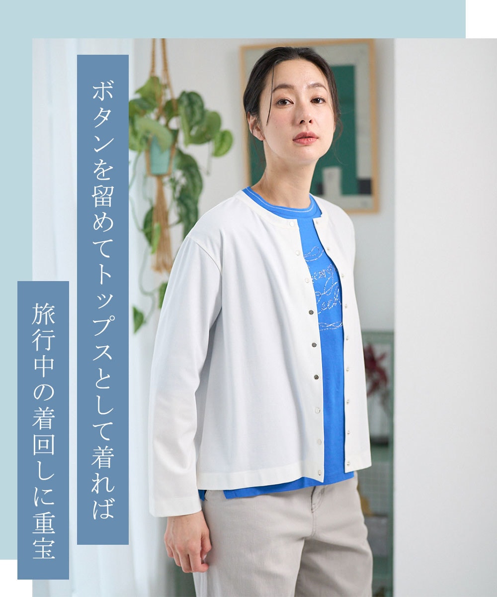脱ぎ着が楽ちんなスナップボタンのカーデは、移動中の温度調節に最適なのもポイントです。