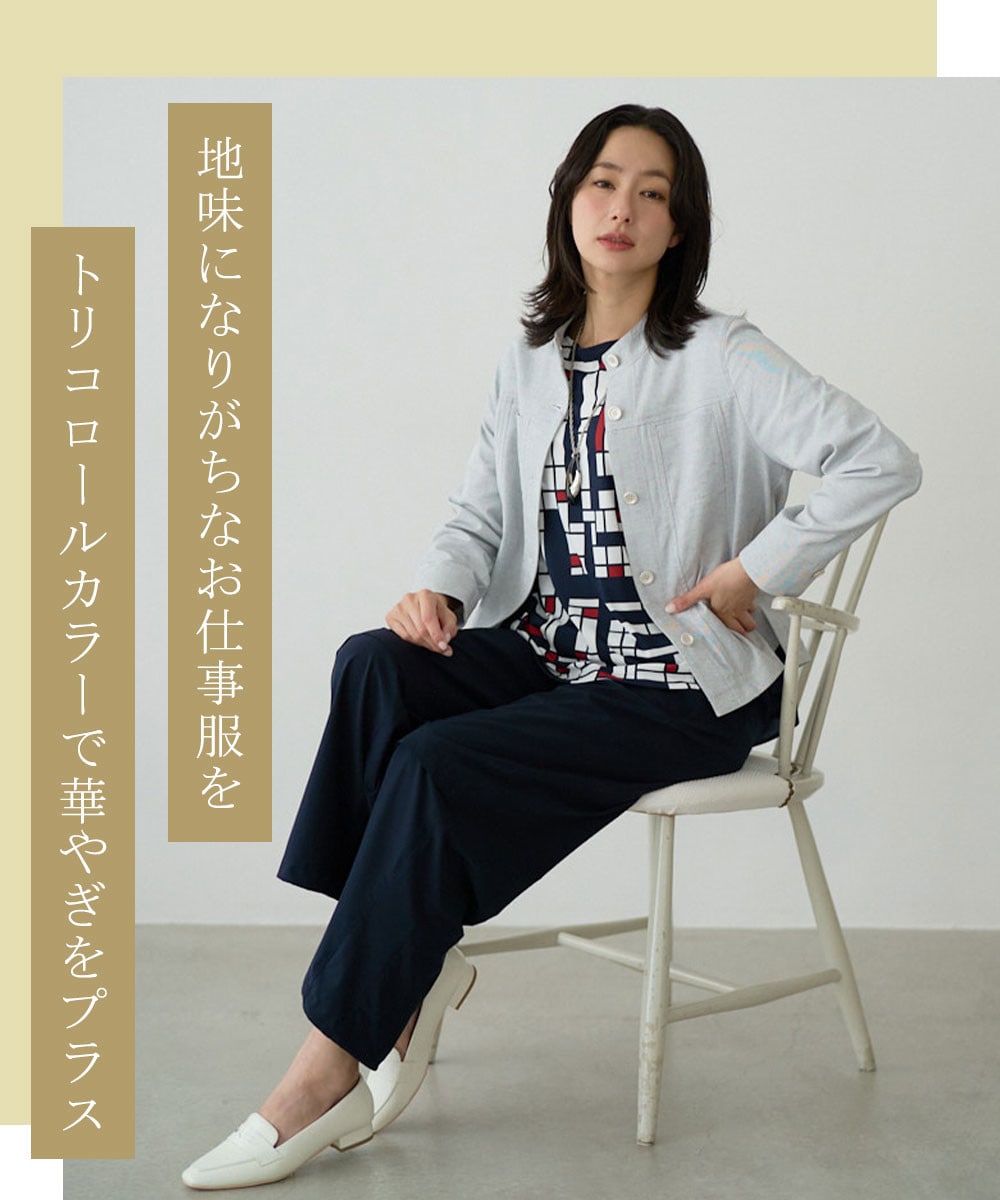 ジャケットで品格を纏いつつ、インナーのトリコロールで親しみやすさをプラス。