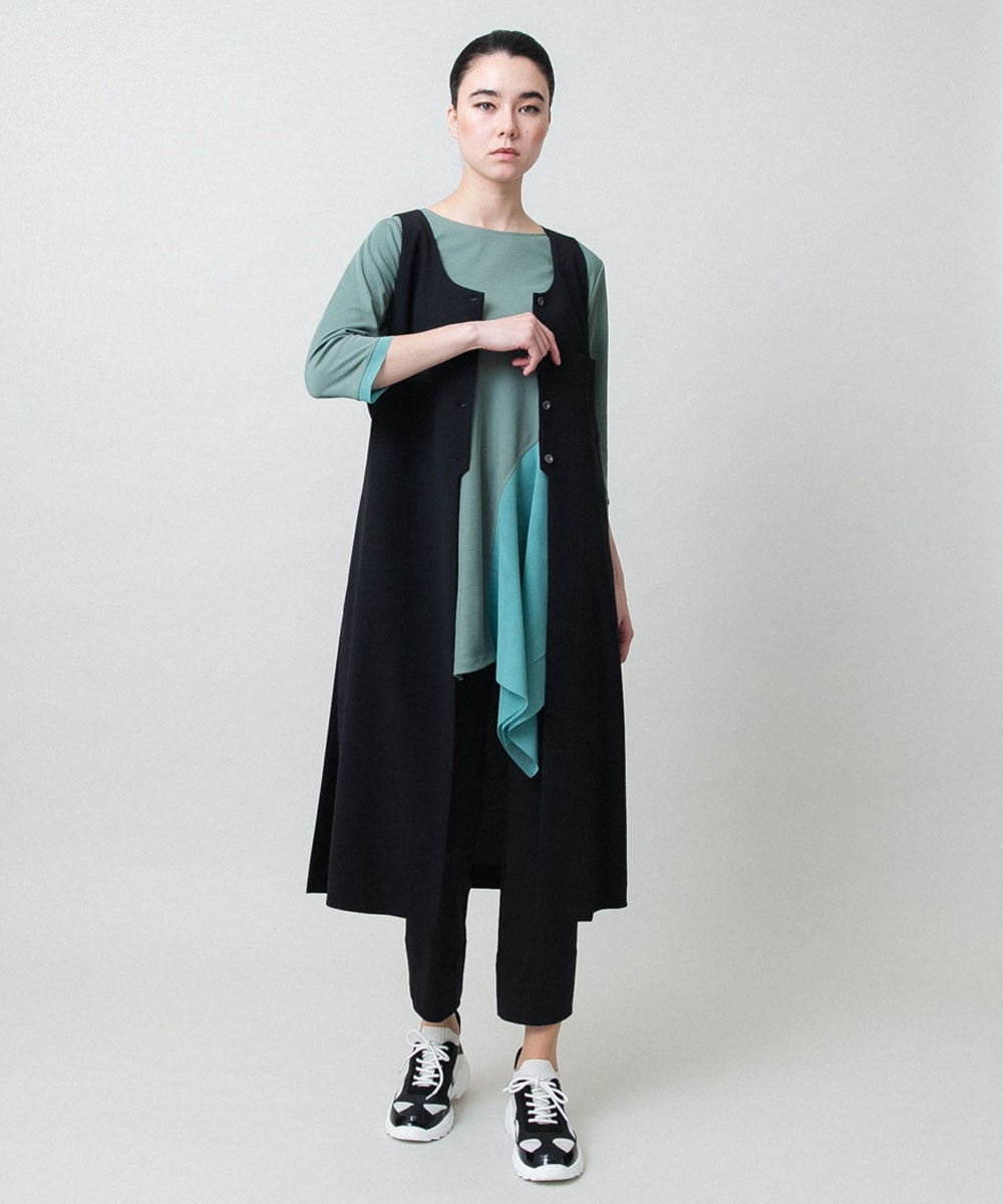 ロングジレが描くシャープな縦のラインに、アシンメトリーなドレープが柔らかな動きを添えるスタイリング。