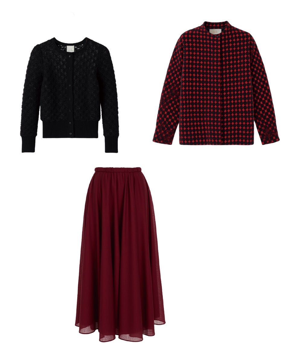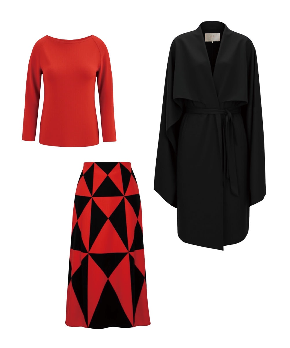 ドラマティックなケープ付きジレを羽織れば、シビラらしいブラック×レッドスタイルの完成。