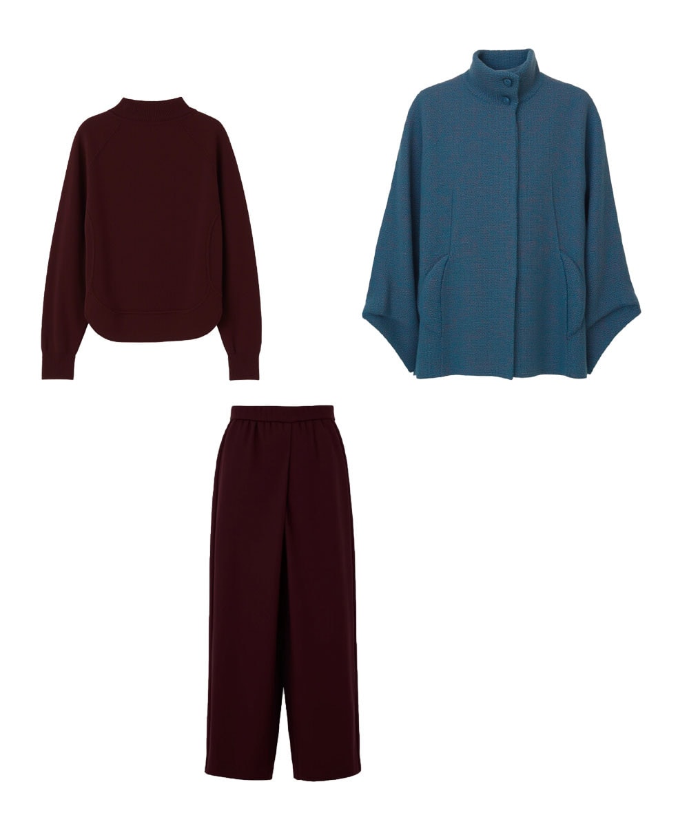 同系色のドットショートコートとブラックのニットで、深く上品なカラーを楽しむスタイリングを。