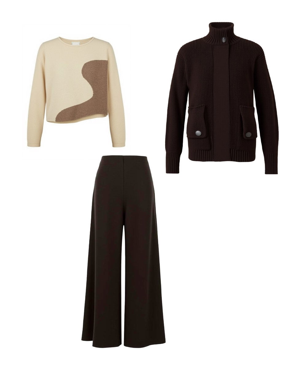 インナーとアウターをニット素材で仕上げた、暖かな大人カジュアルスタイル。