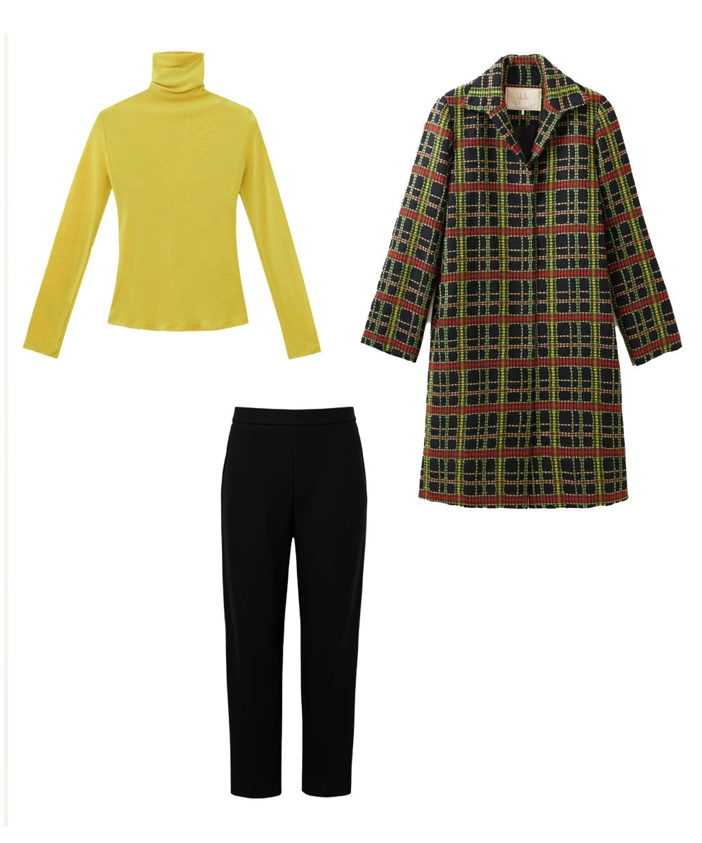 コートの柄とリンクするイエローのタートルをポイントに。