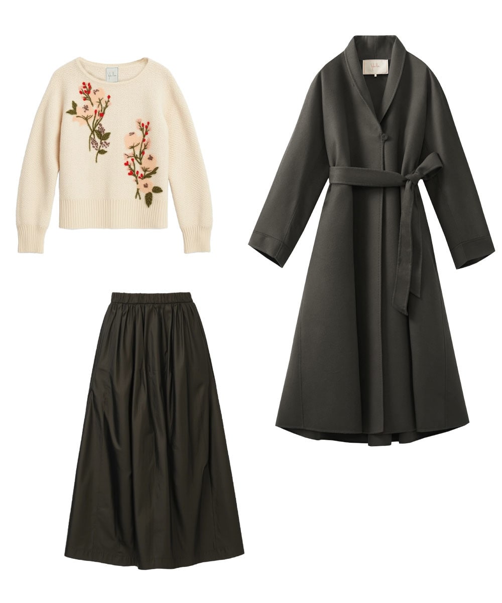 ハンド刺繍のフラワーニットが華やかなアクセントに。