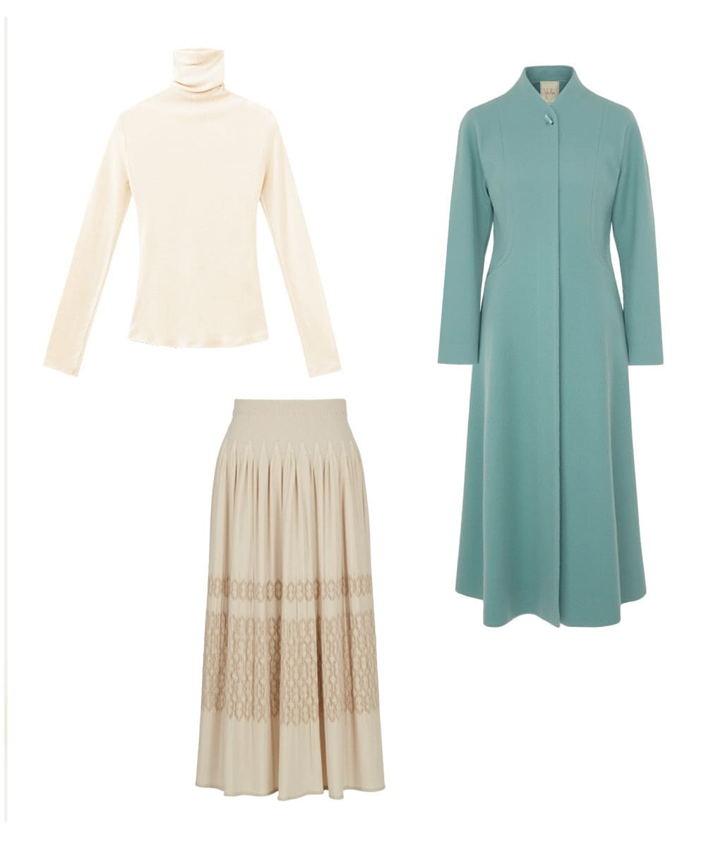 ドレスのように美しいラインのコートは、冬に映えるライトブルーをチョイス。