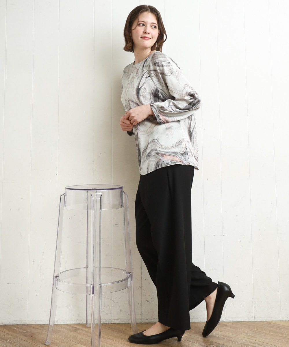 抽象的なプリントが印象的な上品華やかなブラウスで魅せるワンツーコーデ。