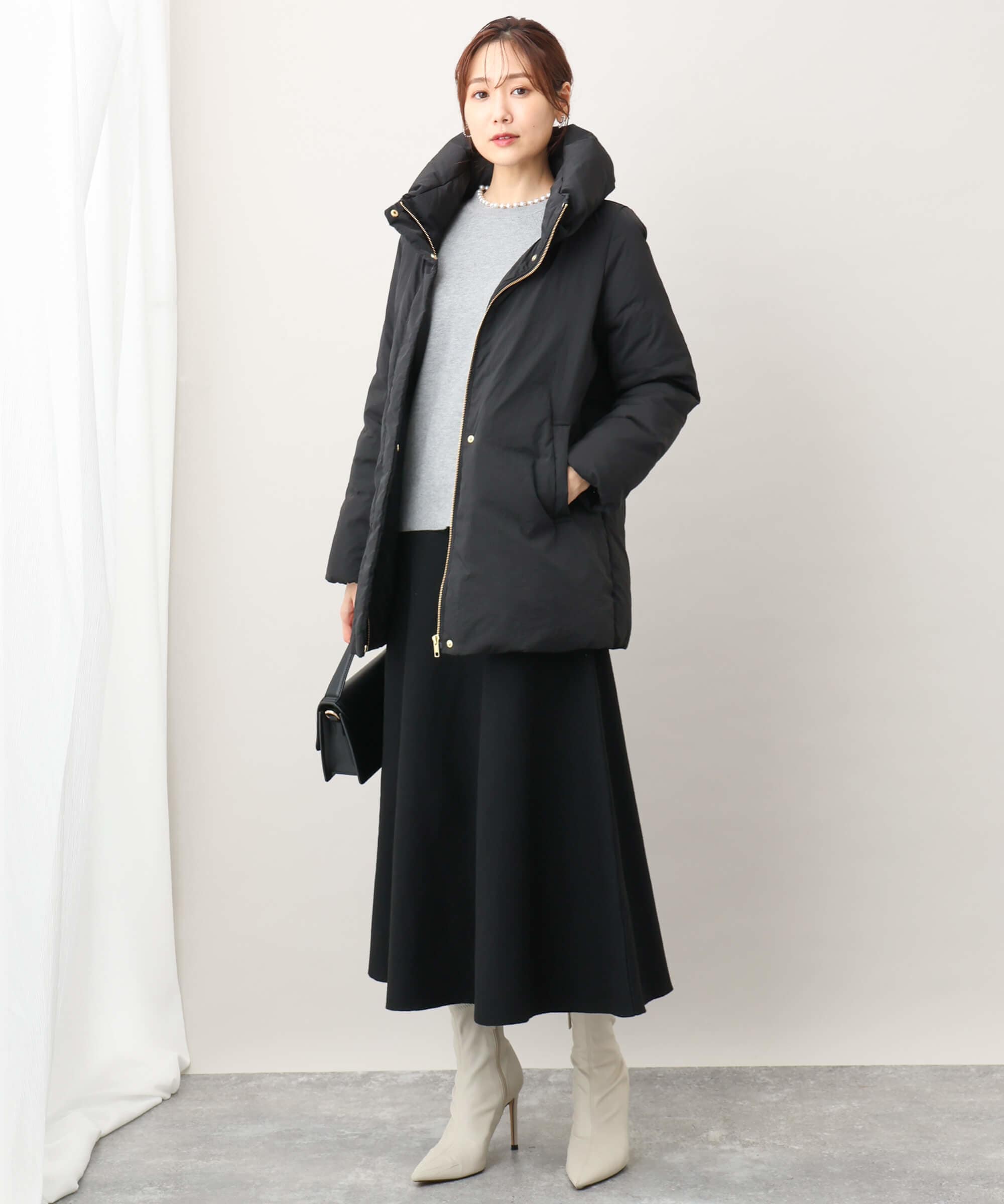 首元にパールがあしらわれたニットなら、シンプルなワンツーコーデが一気に華やぎます。ヒップが隠れるミドル丈のダウンコートはカジュアルになりすぎず、きれい見えを叶える大人世代の強い味方。柔らかなムードをまとえるモノトーンの装いをぜひ。