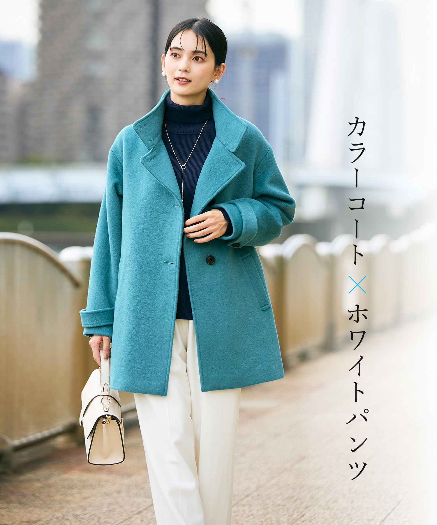 着映えるブルーのスタンドカラーコートと、上品なホワイトパンツのコーディネート。目を引くカラーコートはホリデーシーズンに最適の1着。バランスよく着られるミディ丈なので、スカートを合わせたフェミニンな装いにもマッチします。パンツは裏起毛タイプなので、外出先でも暖かく快適に過ごせます。