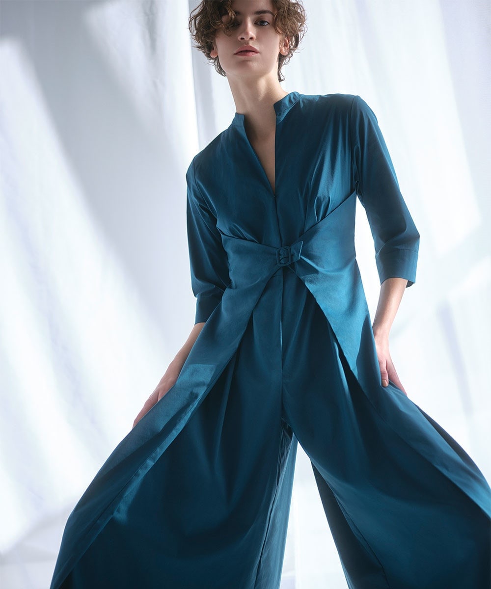 シルキーでライトなコットンナイロンストレッチを使用したジャンプスーツ。