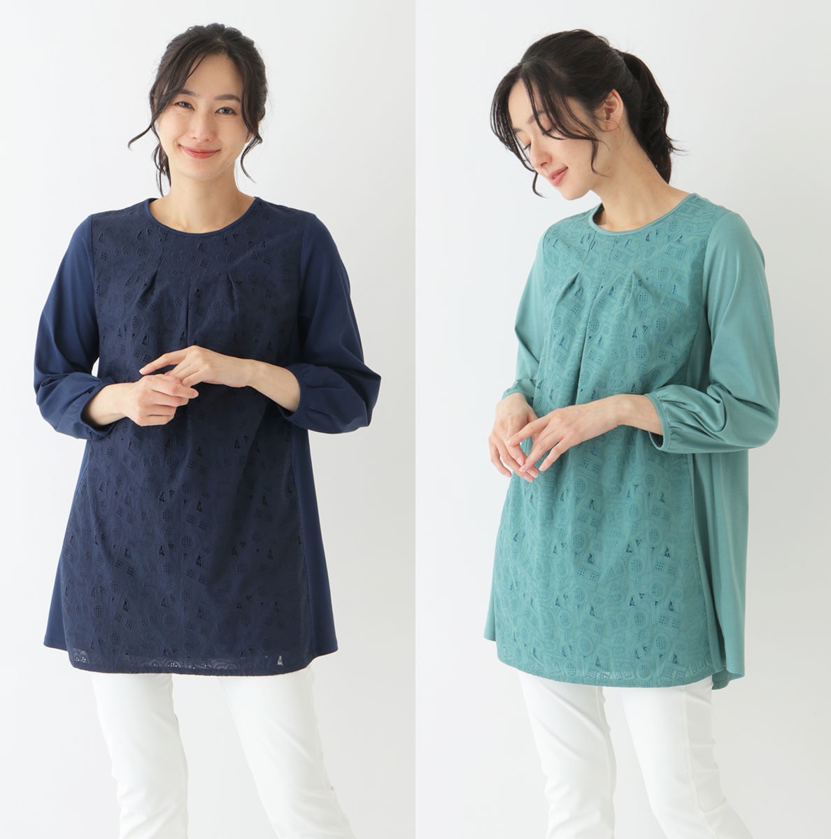 ロゴレースをフロントに使用したカットソージョイントのチュニックは、フロントのタックや広がるAライン、 袖口のタック&ギャザーがフェミニンなデザイン