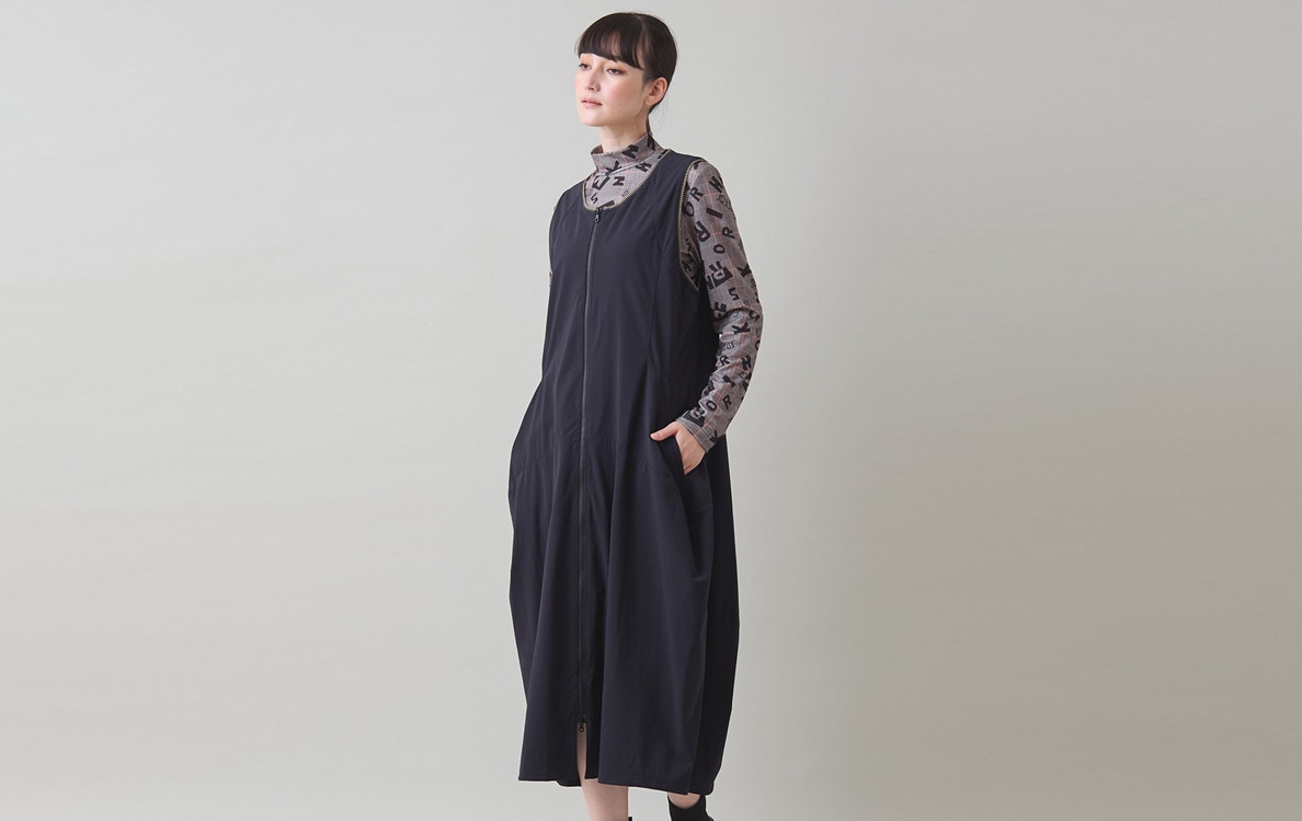 ウエストラインにカーブを付け、立体コクーンのフレアでメリハリあるラインに仕上げたモードなジャンパースカート。
