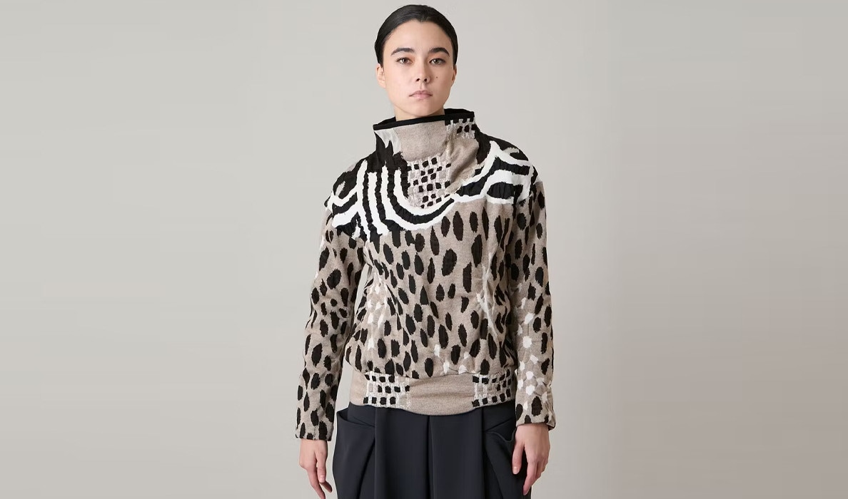 膨れジャカードで表現した大胆な配色モチーフが印象的な唯一無二の一枚。