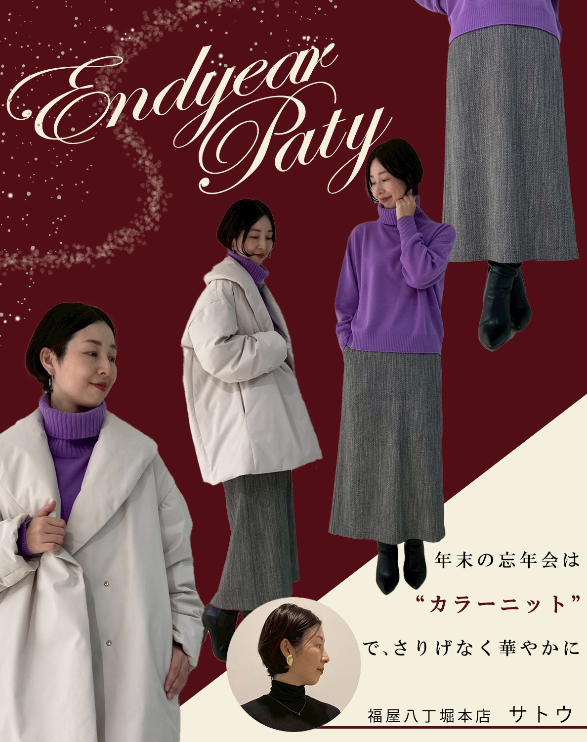 一年の締めくくりである社内の忘年会には、来年のスタートを明るく彩る“華やぎニット”を。