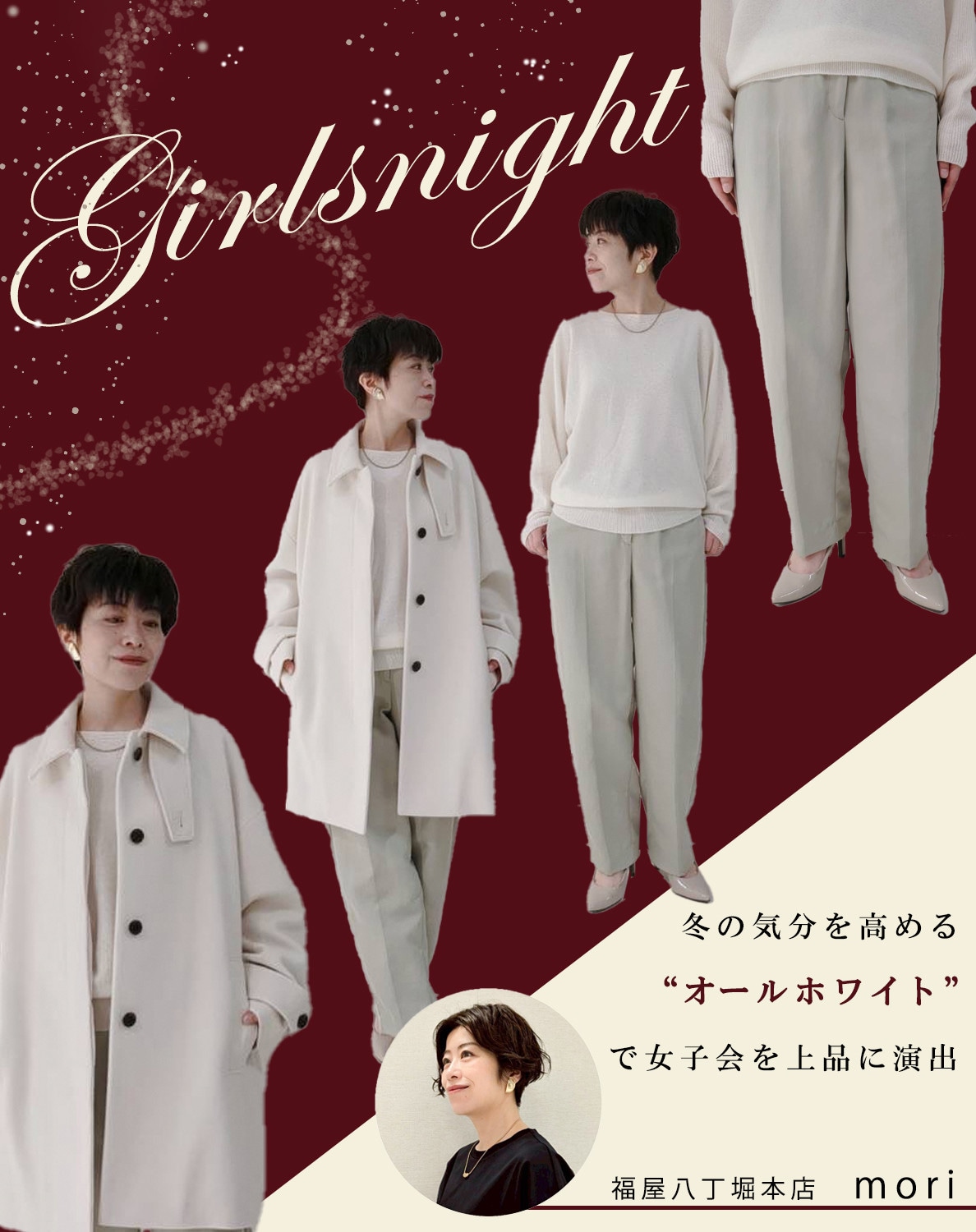 一年がんばった自分たちへのご褒美に、いつもより少し贅沢なディナーで女子会を締めくくり。冬の気分を盛り上げる“オールホワイト”でスタイリッシュかつ上品に。