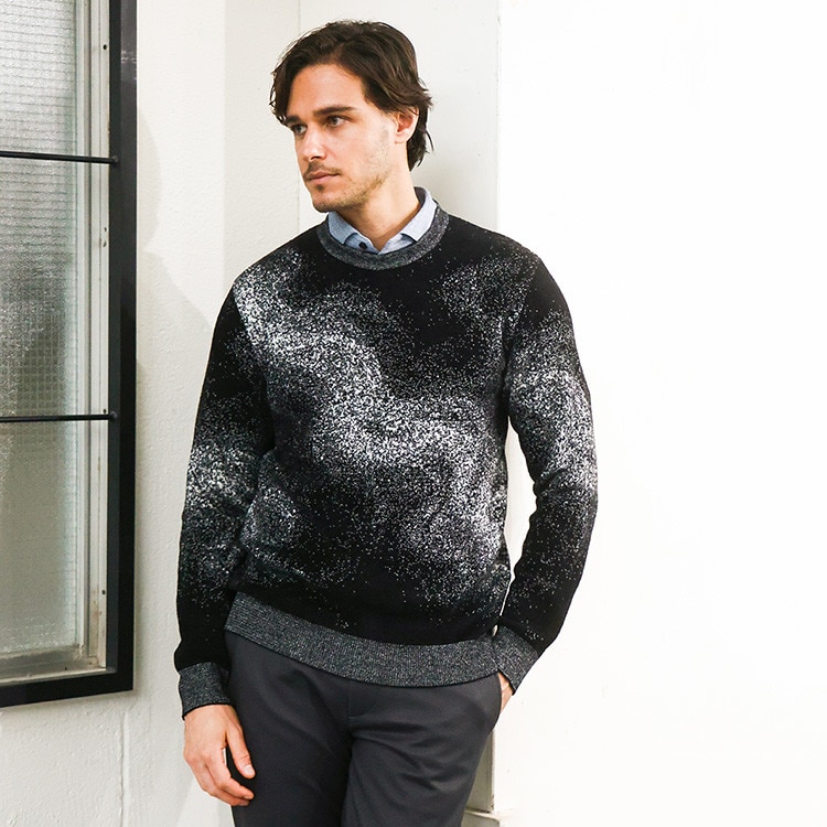 身頃同様に2配色の柄入りリブ、ウェービーなモールを1コースことに編み込んだデザイン。点描のように、点の密度で濃淡をつけ、陰影や質感、煙表現を描き出した柄行。