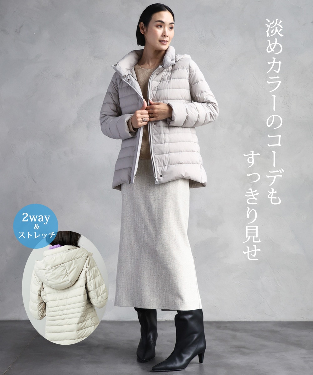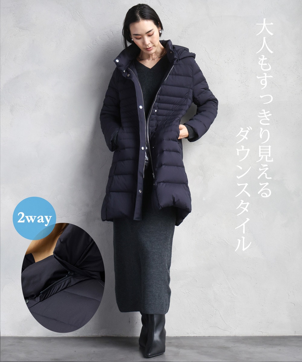 重たくなりすぎないネイビーのダウンコートは、ウエストシェイプされたシルエットですっきり見えるデザイン。ヒップ周りもしっかりカバーしてくれるダウンには、ニットアップをあわせて、きちんと感と着やすさをキープ。