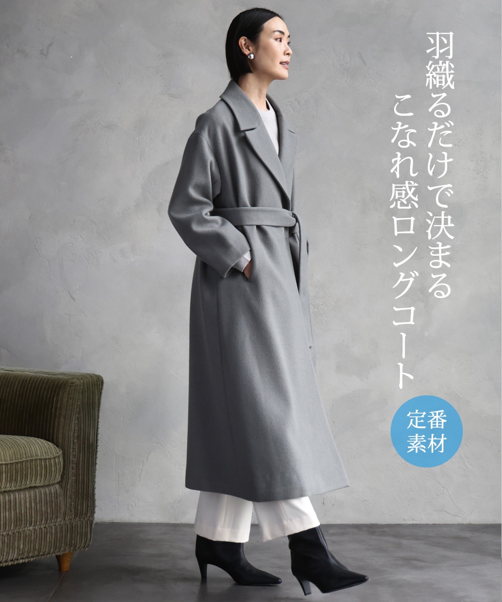 贅沢な分量感のロングコートは、羽織るだけでこなれ感のあるスタイルに。ニュアンスカラーのカーキを選べば重たくなりがちな冬のコーデも印象チェンジ。長くても重さを感じにくいのは毎シーズン更新しているパターンのおかげ。