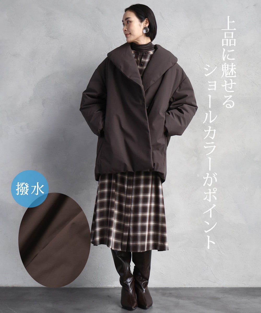 ショールカラーと立体的なシルエットが特徴のダウンコート。こっくりからーのブラウンにチェックのワンピースをあわせて上品な印象に。柔らかな雰囲気が魅力のスタイリングです。
