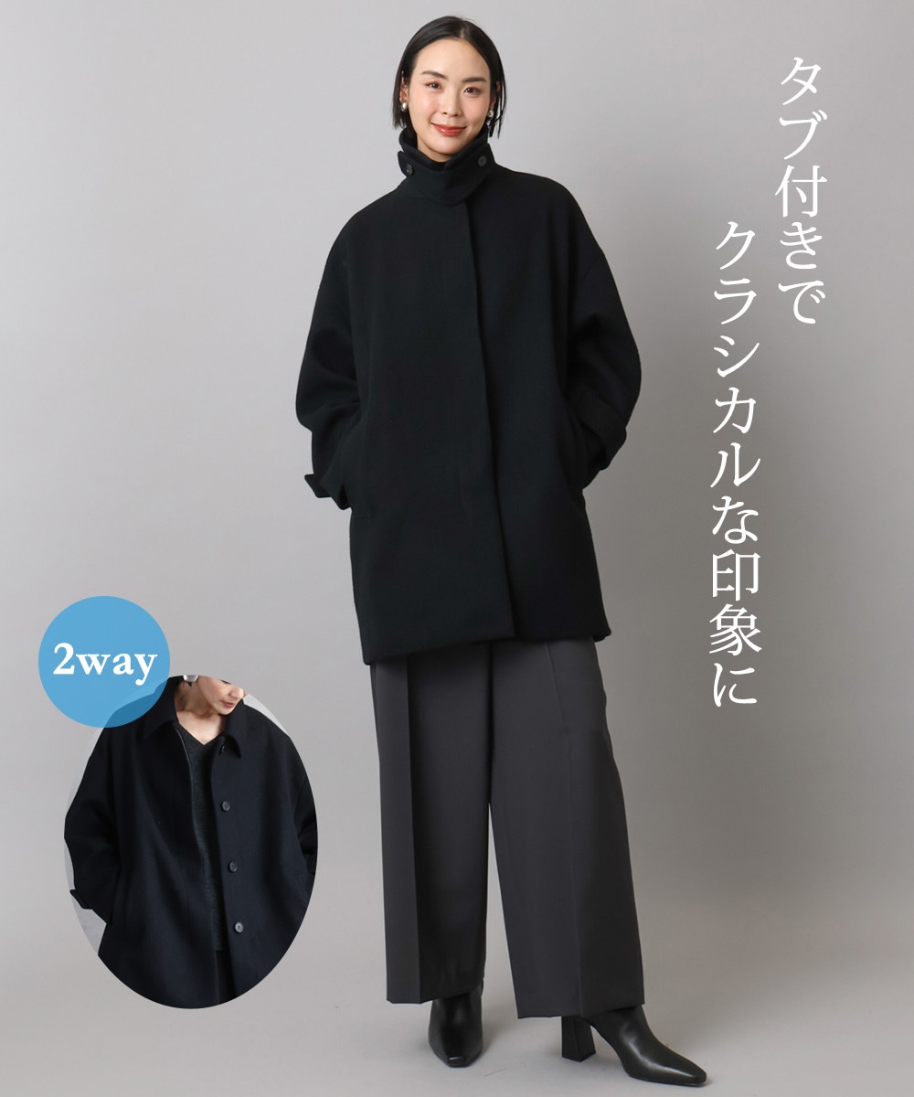 定番のブラックのコートは、タブ付きのコートを選んでクラシカルな印象に。デザイン性と防寒とを両立します。ワイドパンツにもあわせやすいミディ丈。スカートにもマッチするので、コーデの幅が広がります。