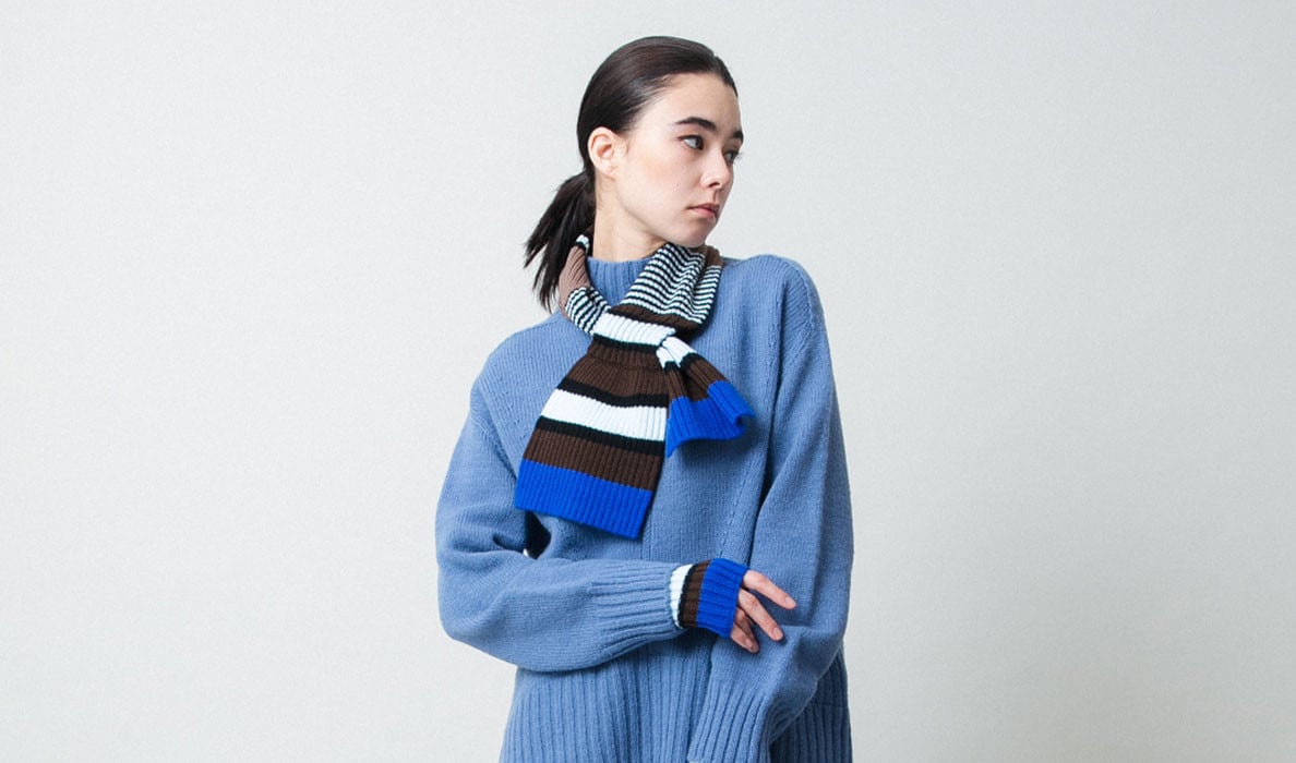 発色の良いアクリルニットを使用したライトなデザインマフラー。