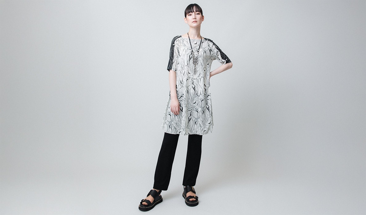 前後で切り替えた大胆な配色が、モノトーンの中にアーティスティックな存在感を放つ一枚。