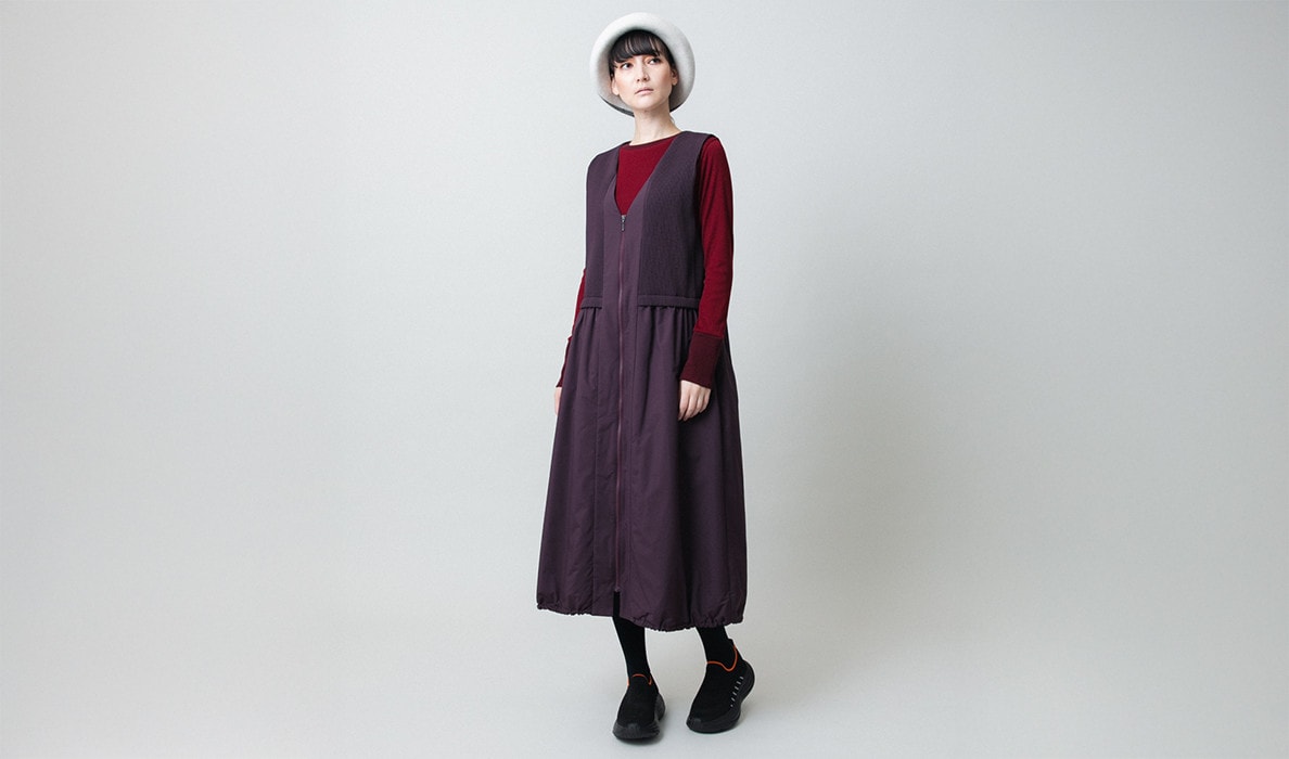コンパクトな衿元から広がるAラインフレアが、動くたびに美しいシルエットを描きます。