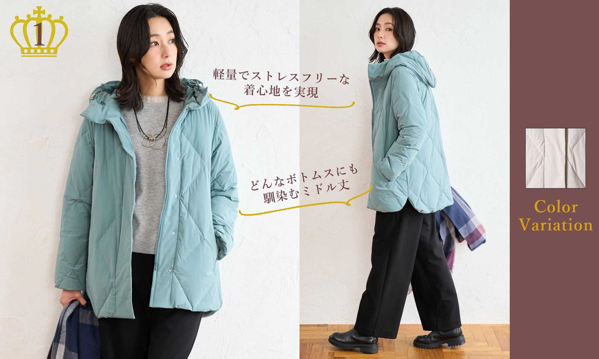 とても軽量でストレスフリーに着用できるダウンコート。前後差のある丈で、気になる腰回りはしっかり隠してくれる安心感のある1着。