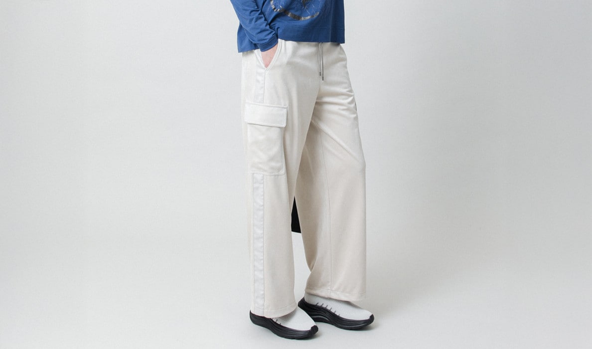 ワークテイストなフラップポケットをサイドに施し、テープアクセントでスポーティーに仕上げたカジュアルな一本。