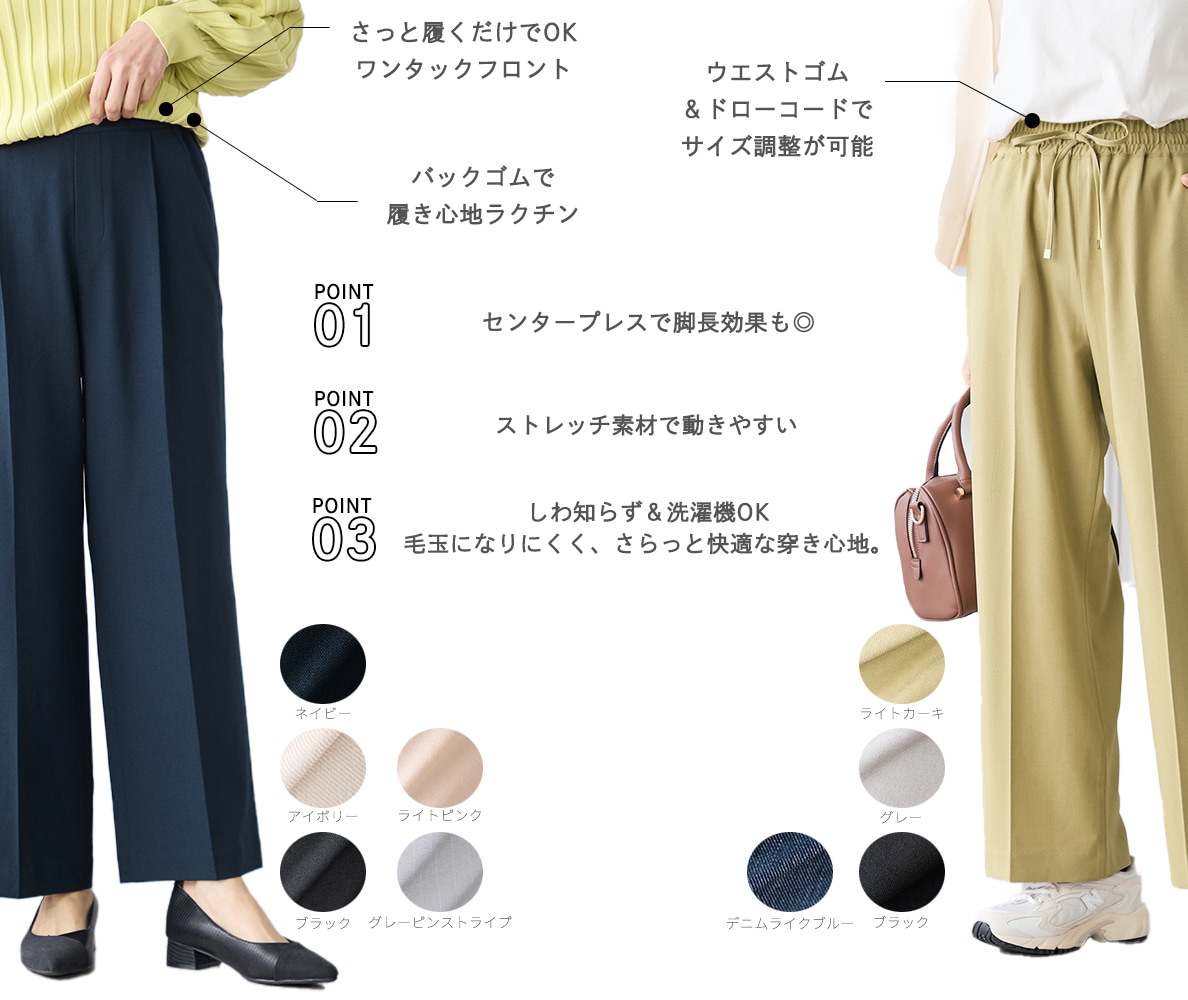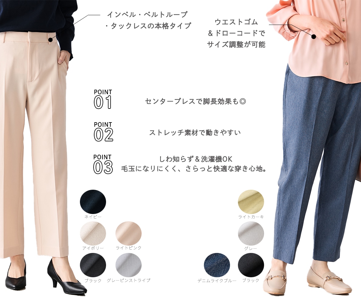 ウエストが綺麗に見える“スッキリ見えパンツ”から、新登場の①ストレートと②ワイドの2タイプ。
