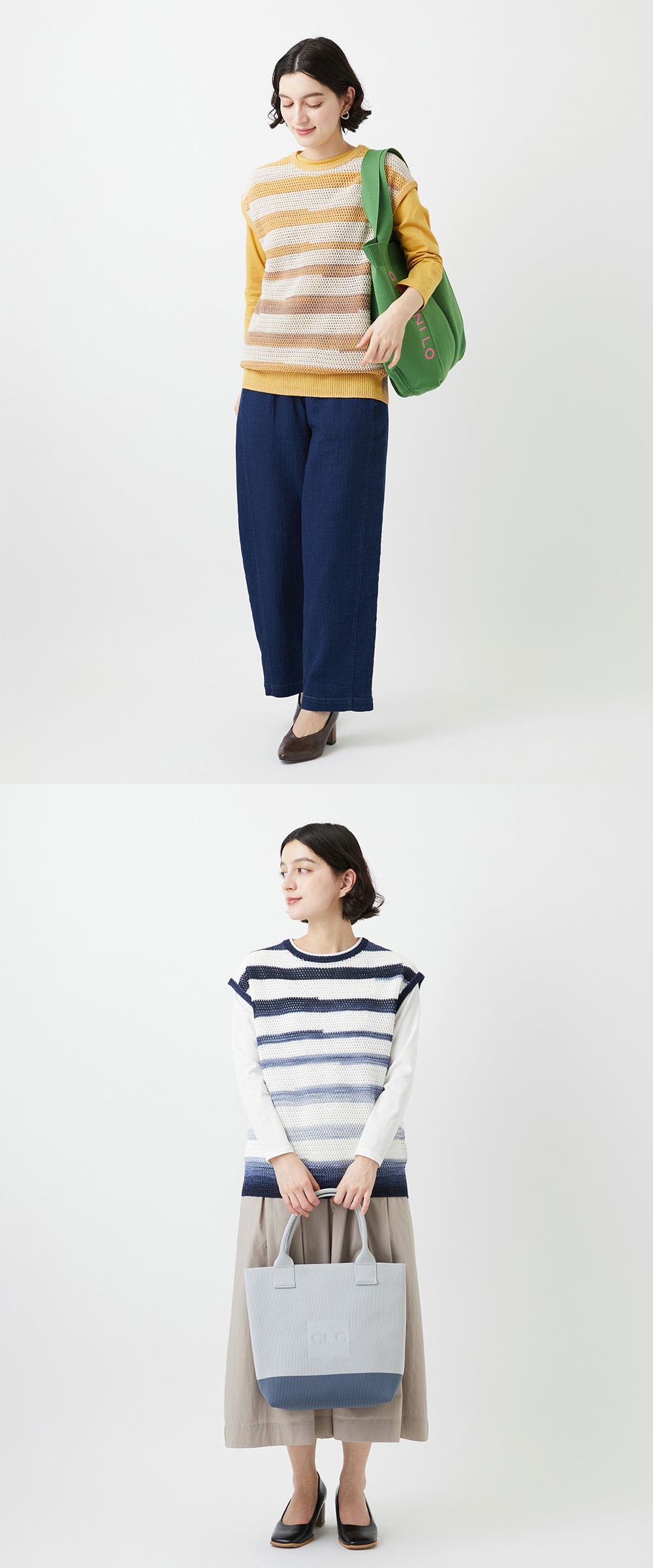 ボーダーやチェック柄をアクセントに、コーディネートに軽やかな表情をプラスして。