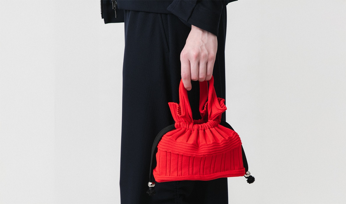 コロンとした巾着風フォルムが洒落感溢れるニットバッグ。