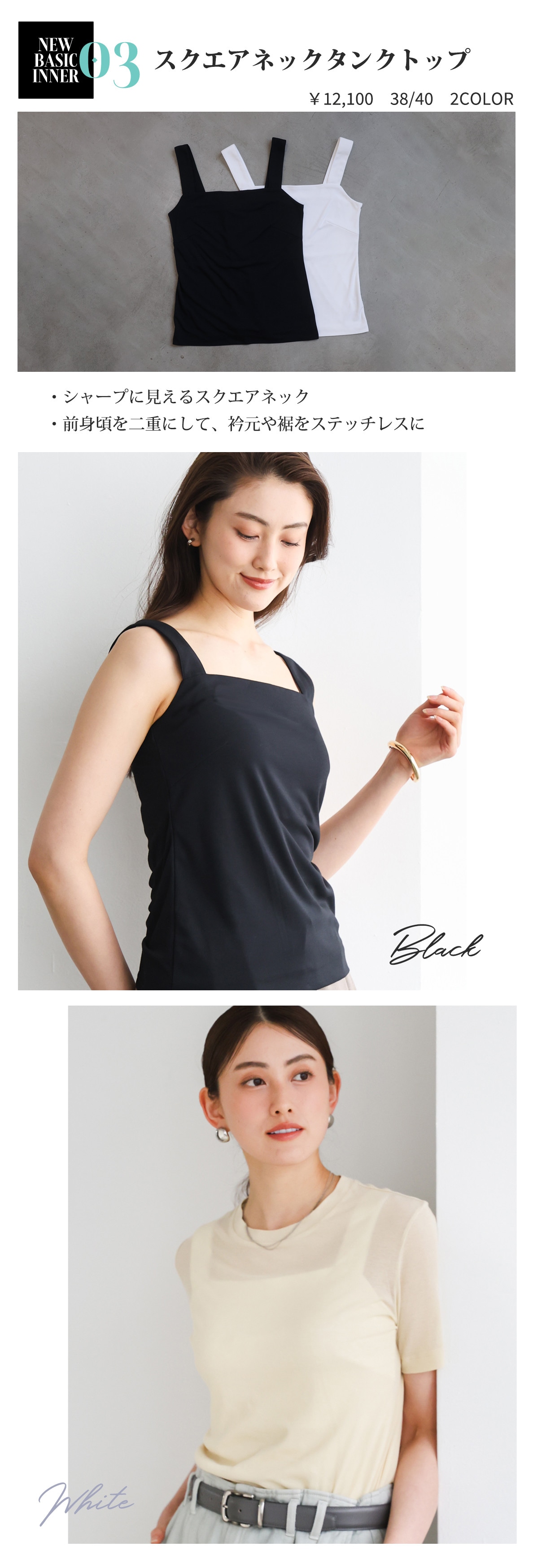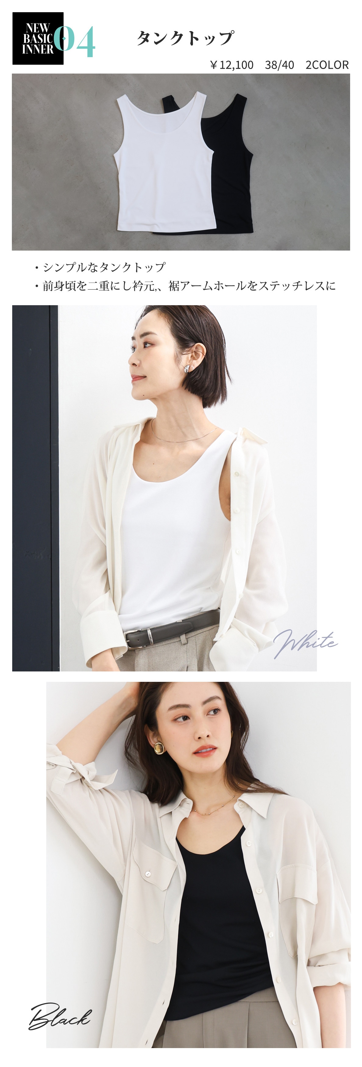 衿元をストレートにしたタンクトップはジャケットやジレのインナーとしてマッチしやすく、スマートな印象に。シアーなアイテムとあわせてレイヤードスタイルにもおすすめ。