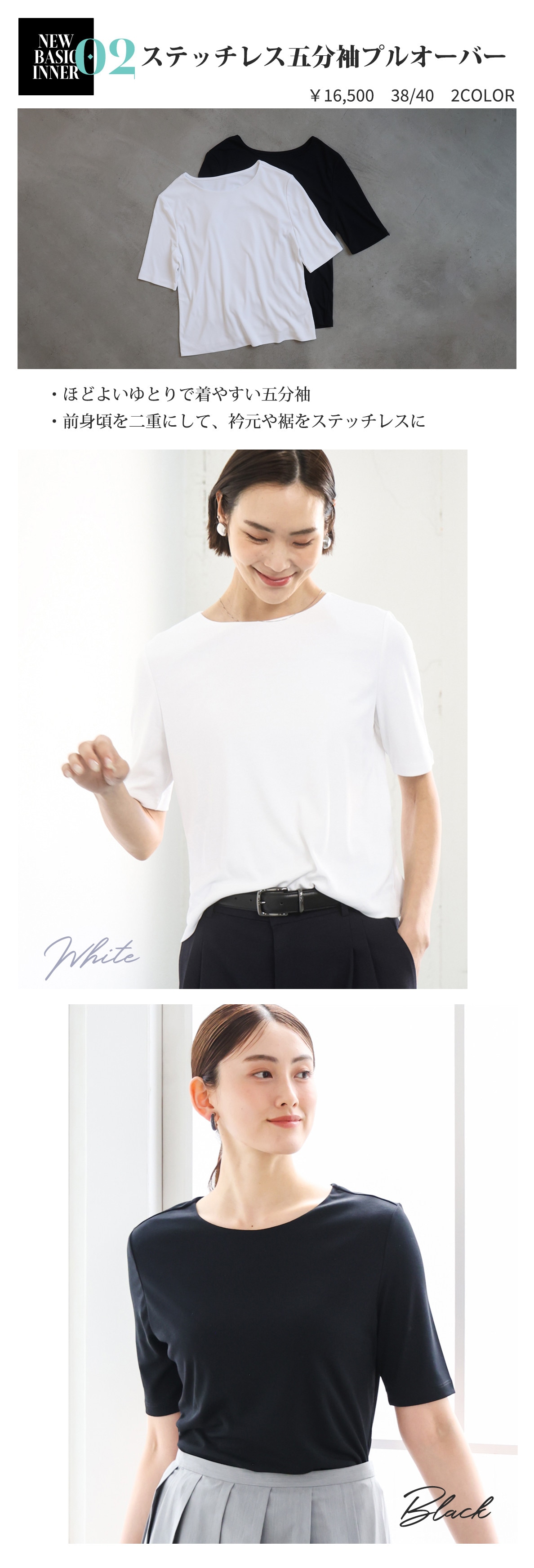 つまりすぎない衿あきと、さりげなく気になる部分をカバーしてくれる五分袖が嬉しい一枚。前身頃を二重にしてステッチをなくし、下着もひびきにくくなっています。あわせるアイテムを選ばず、クローゼットに揃えておきたいアイテム。