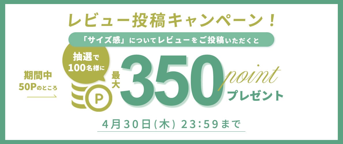 ※レビュー投稿キャンペーンの特典「50ポイント」は、サイズ感についての投稿に限らず、その他の商品レビューでもプレゼントいたします。