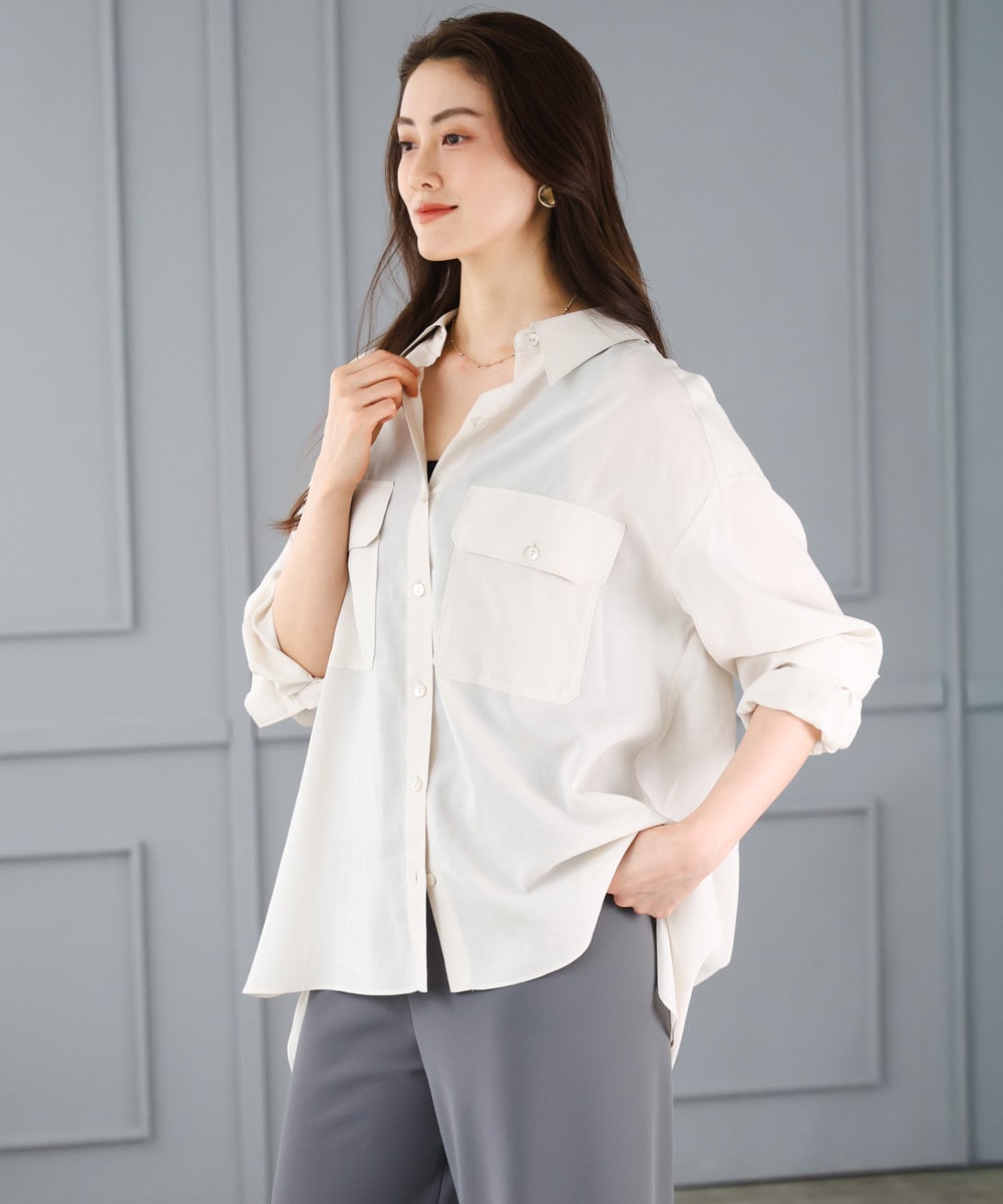 程よいシアー感が旬な印象のオーバーサイズシャツブラウス。ゆったりとしたサイズ感でもルーズに見えないのは上質素材のおかげ。一枚着風に着たり、羽織ったりと幅広い着こなしが楽しめるシャツブラウスです。
