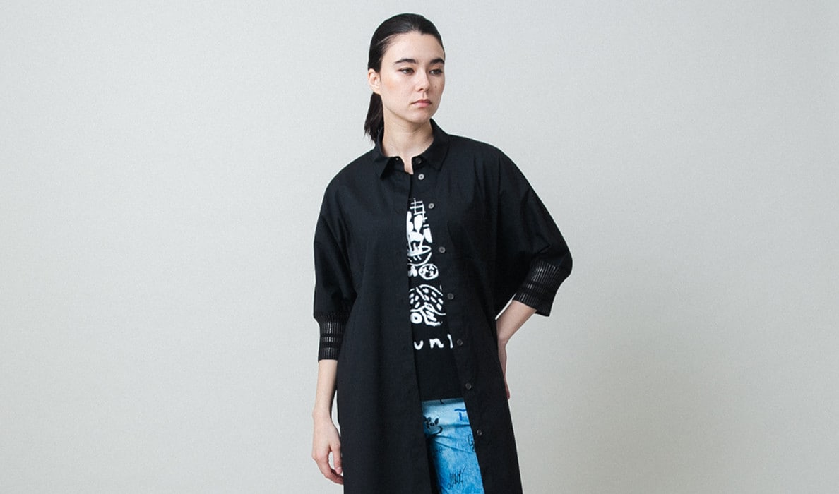 メンズシャツ風のオーバーシルエットながら、ドルマンスリーブやヘムラインの丸みフォルムが女性らしいアイテム。