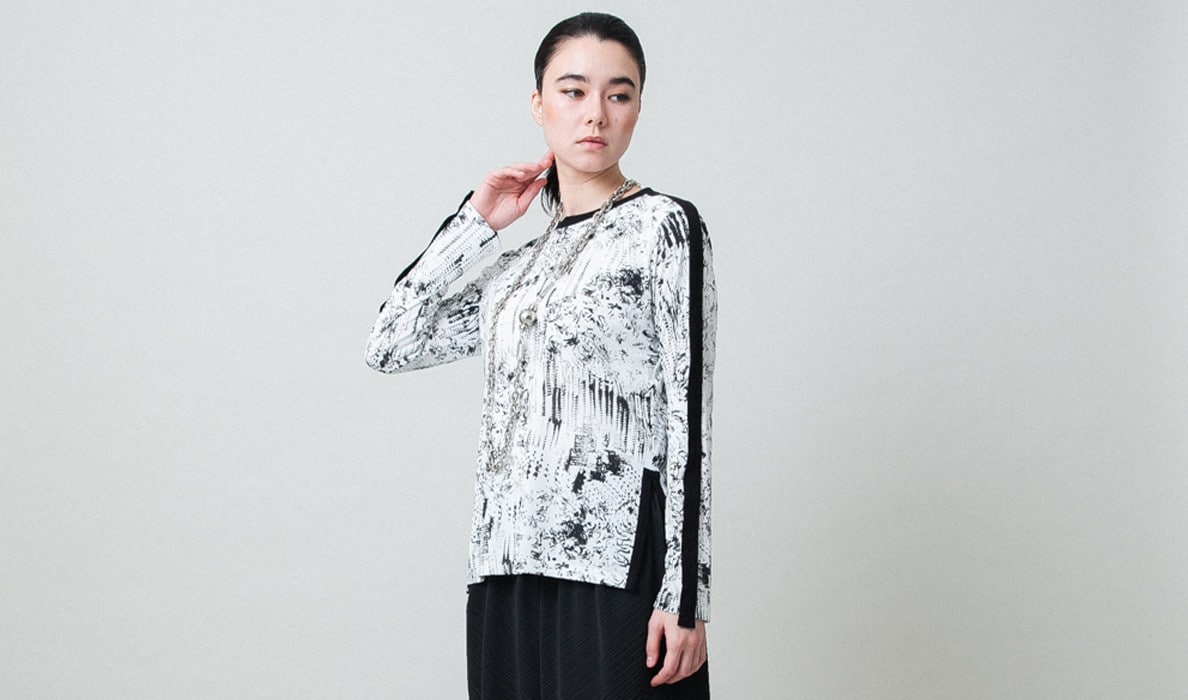 モノトーンで描かれたアーティスティックな柄が印象的なカットソー。