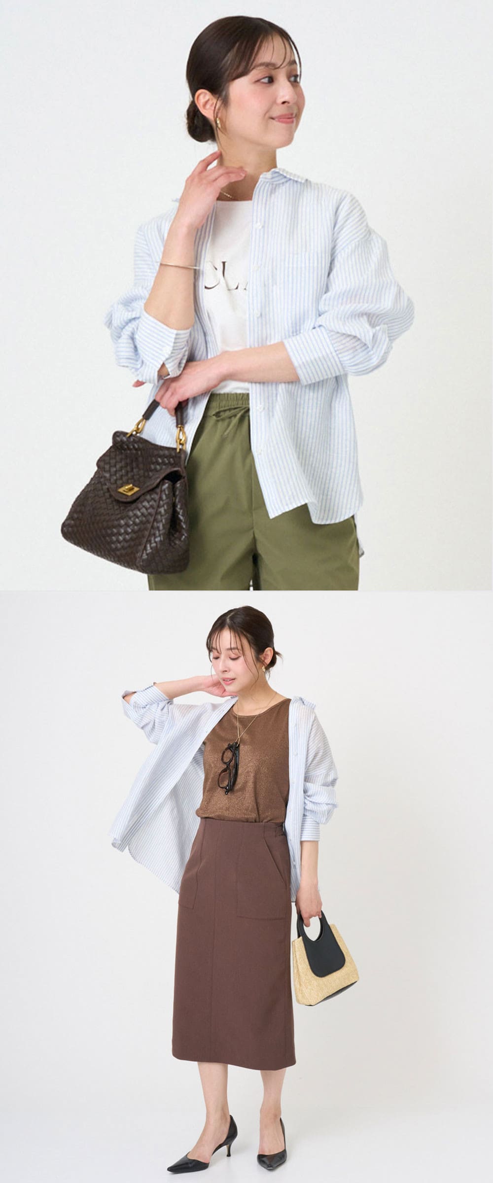 軽やかなストライプシャツを主役に、アースカラー合わせの大人最旬スタイル。