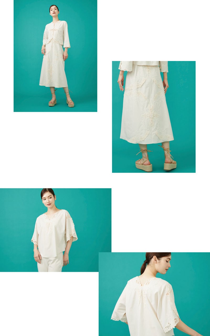コットンメッシュ素材に、色彩豊かな花々の刺繍を施したライトジャケット&シャツドレス。