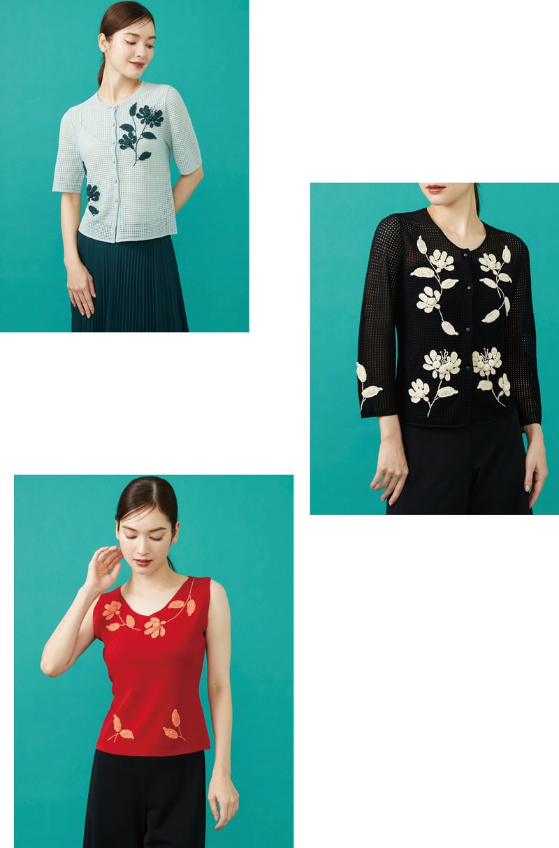 芍薬の花をハンドクロッシェで編んだモチーフを、刺繍で貼り付けたカーディガン&プルオーバー。