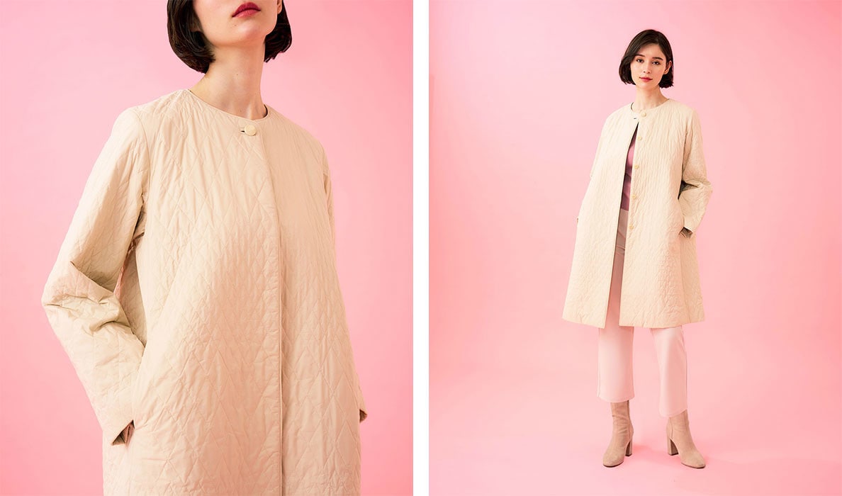 ダイヤ柄のステッチでアクセントをプラスした中綿キルトコート。