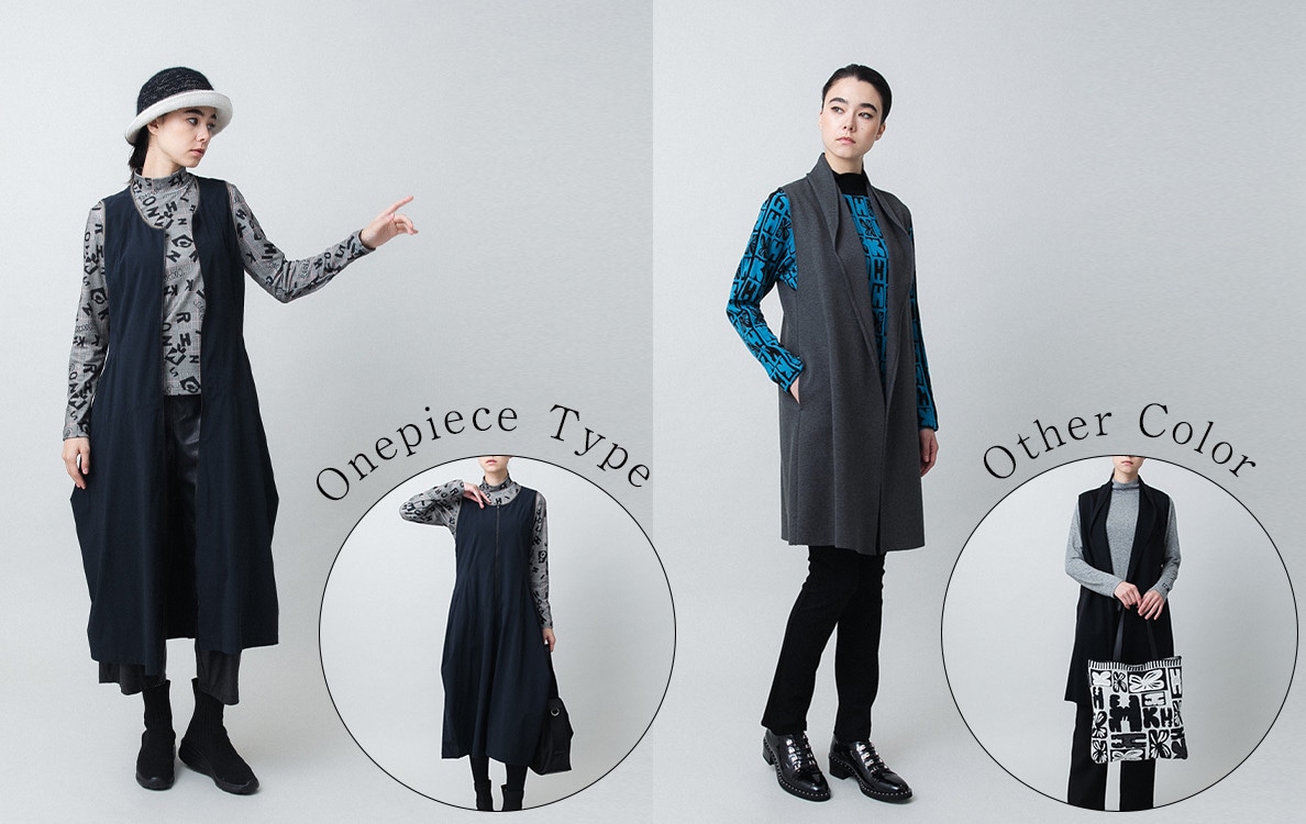 【左】ロングジレは、前を閉じてジャンパースカートとしてもスタイリングできる。