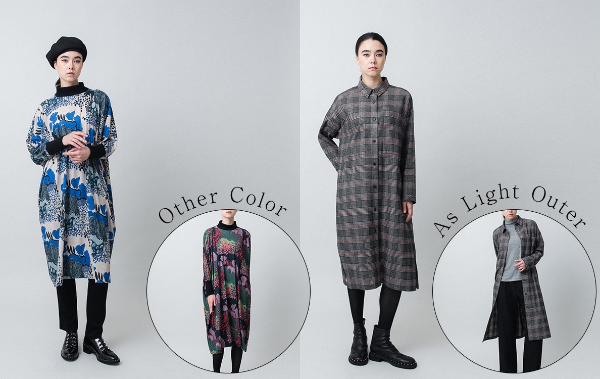 【右】チェック柄が秋らしいシャツワンピース。ライトアウターとしてカジュアルに着用したスタイリングも。