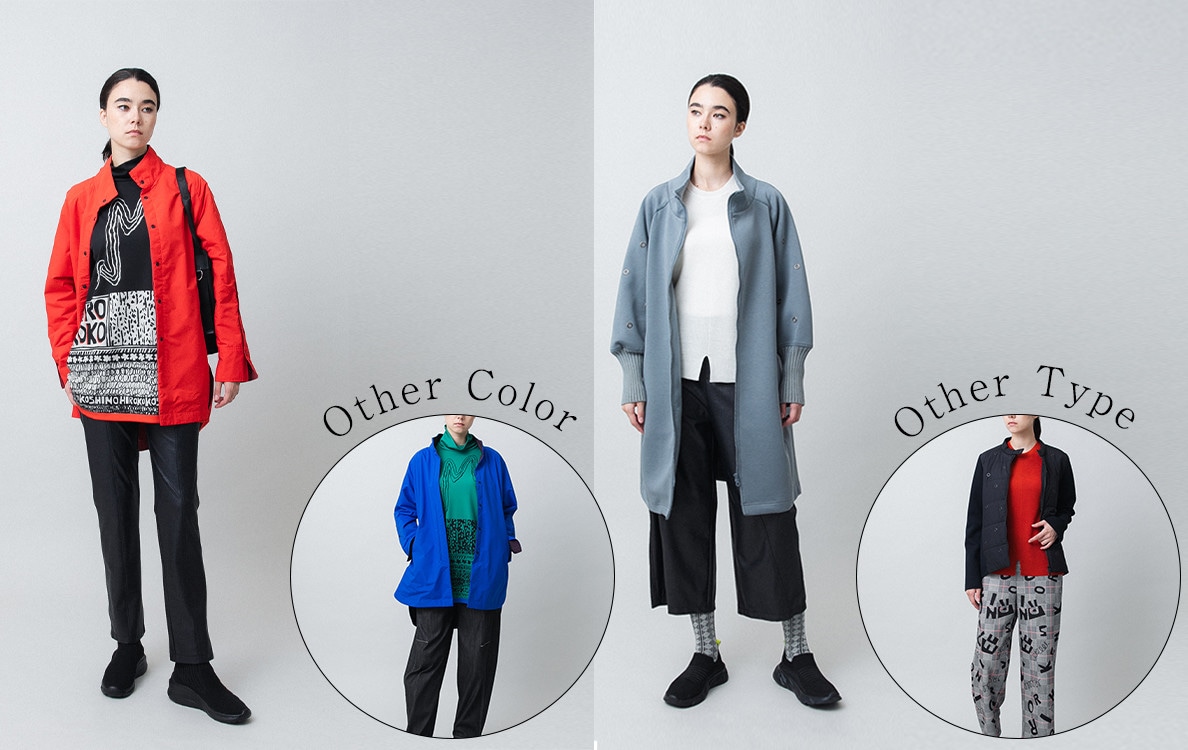 【左】雨でも安心なナイロン素材のリバーシブルタフタコートは、インナーの色味と合わせて統一感のあるスタイリングに。