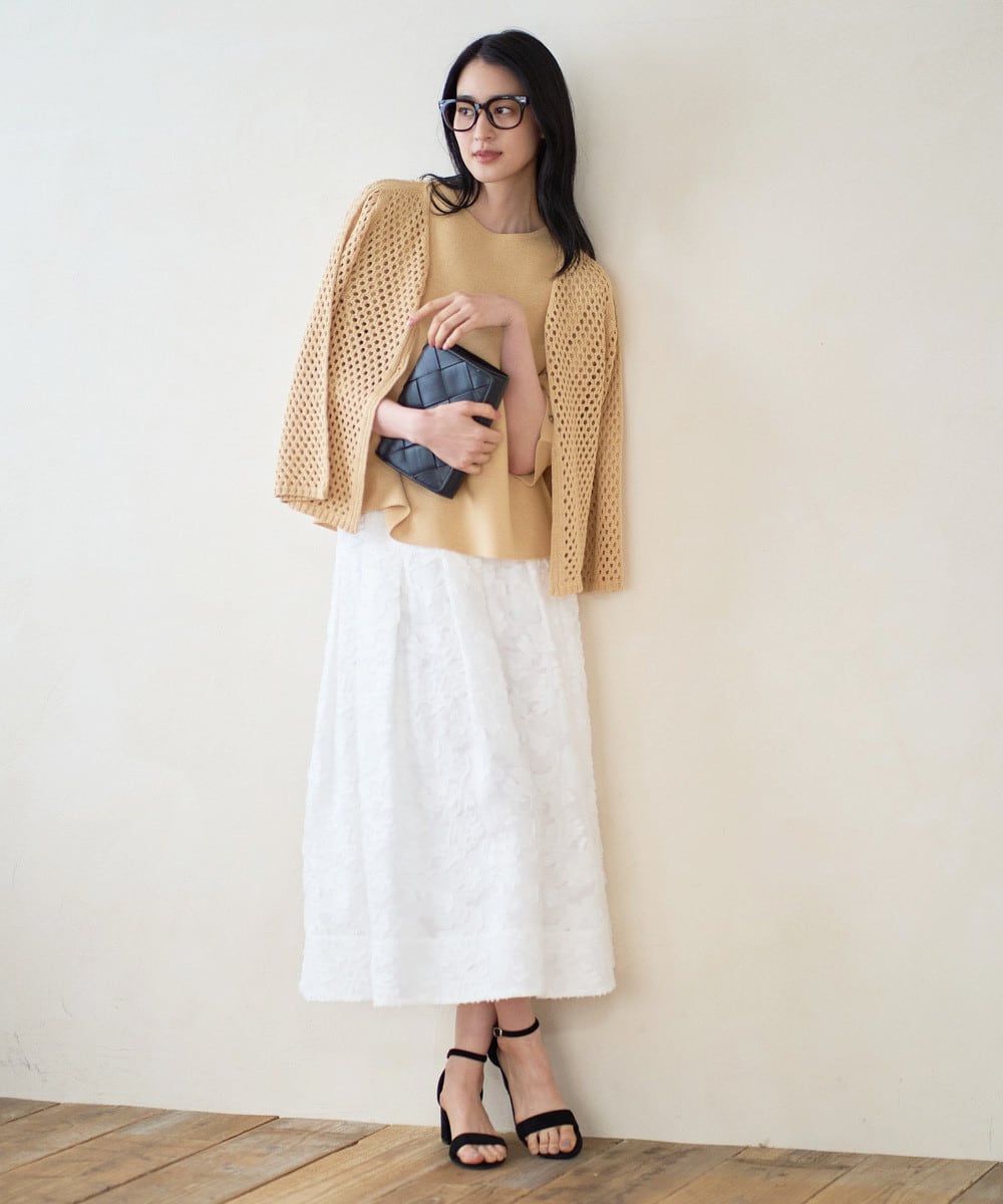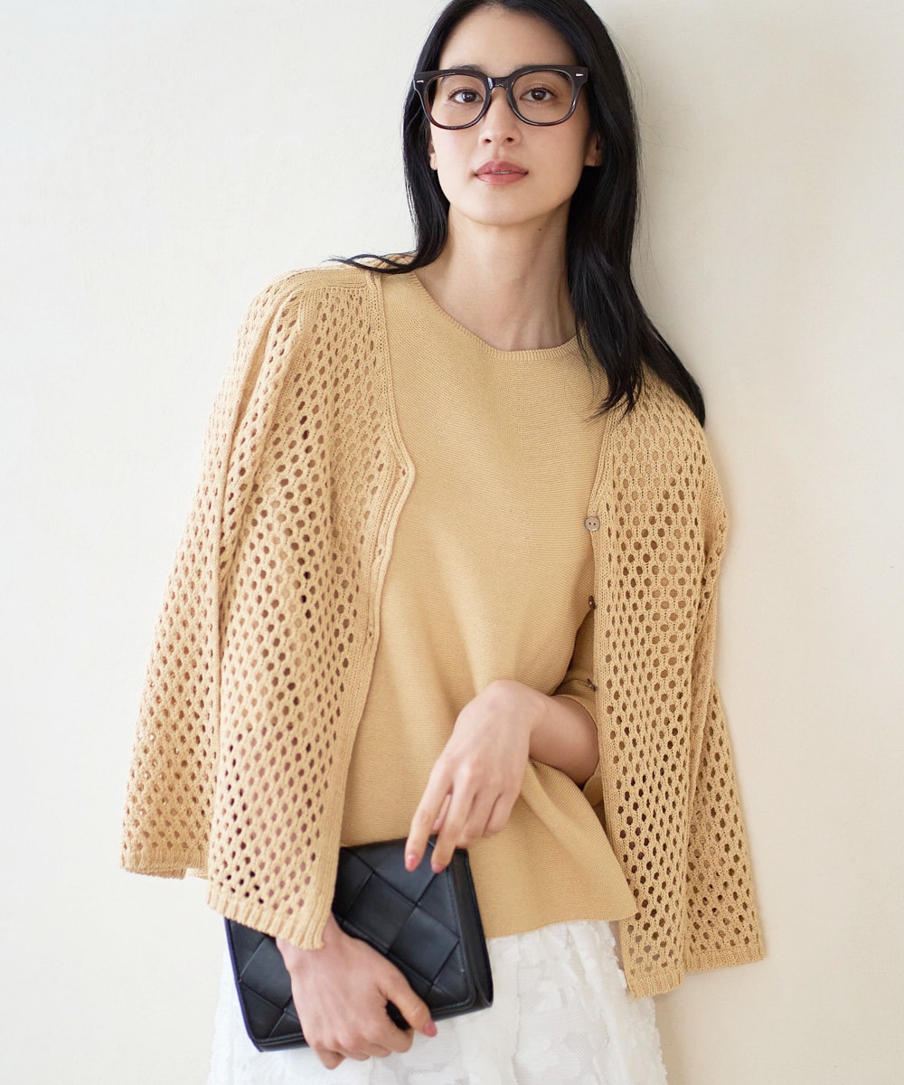 メッシュ編みカーディガン×同素材プルオーバーで、軽やかに整うレイヤードスタイル。ジャガードスカートを合わせて、ラフすぎない大人のきれいめカジュアルに。さらっとした着心地で、カフェで過ごすひとときにも心地よく決まるコーデです。