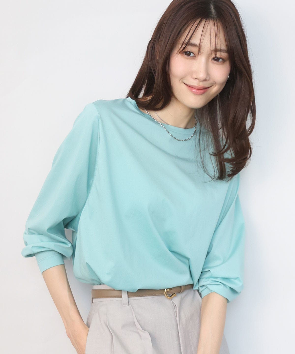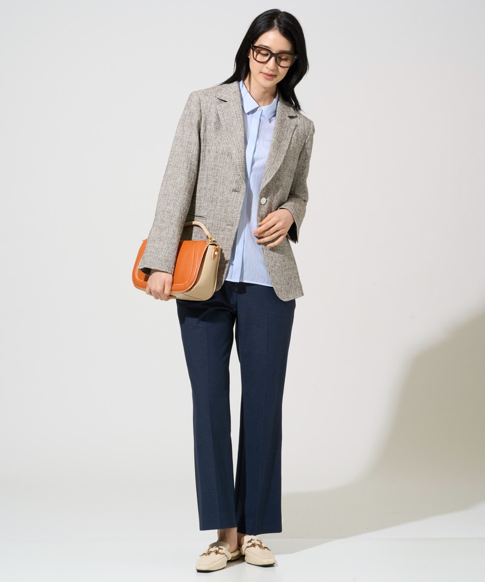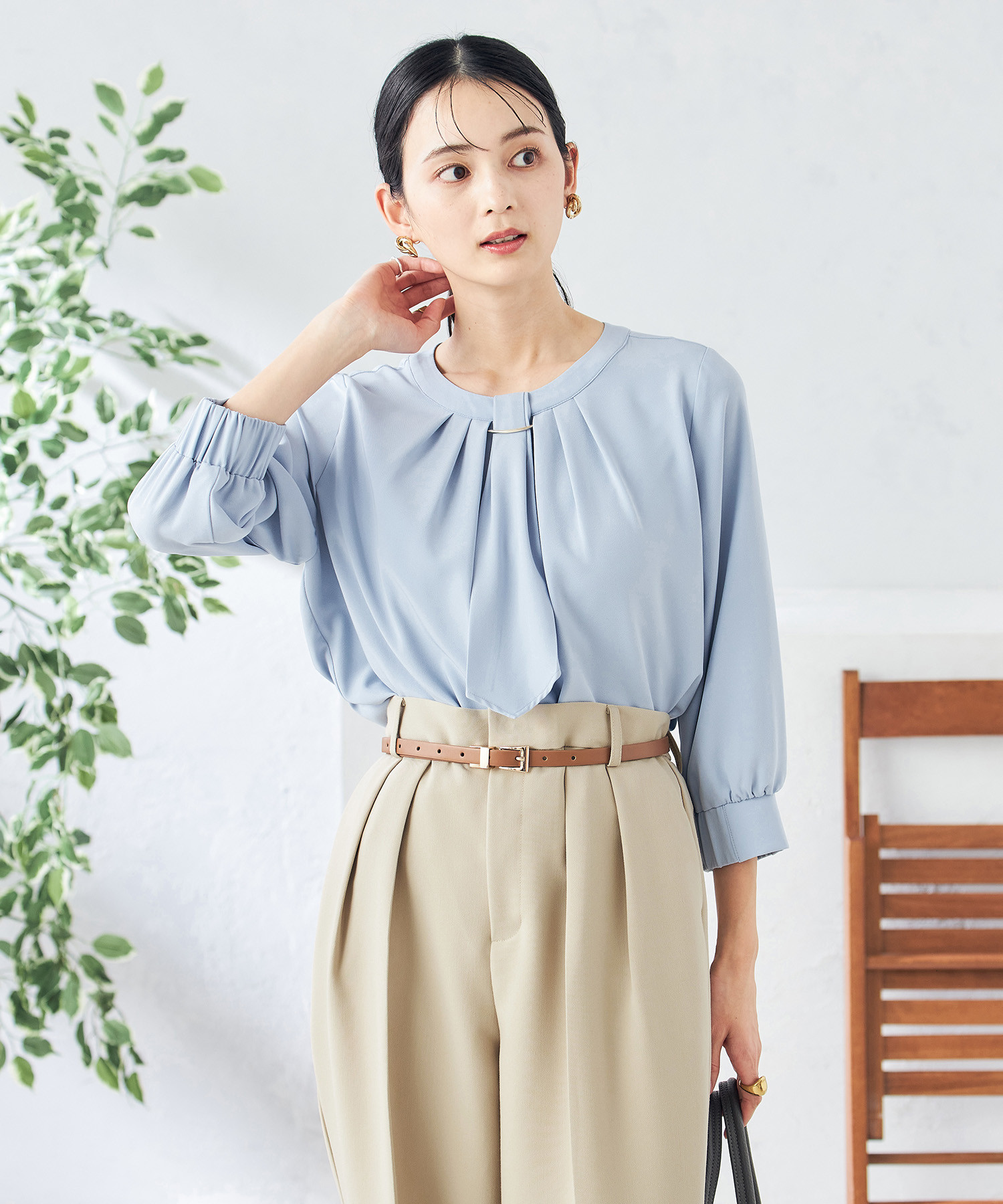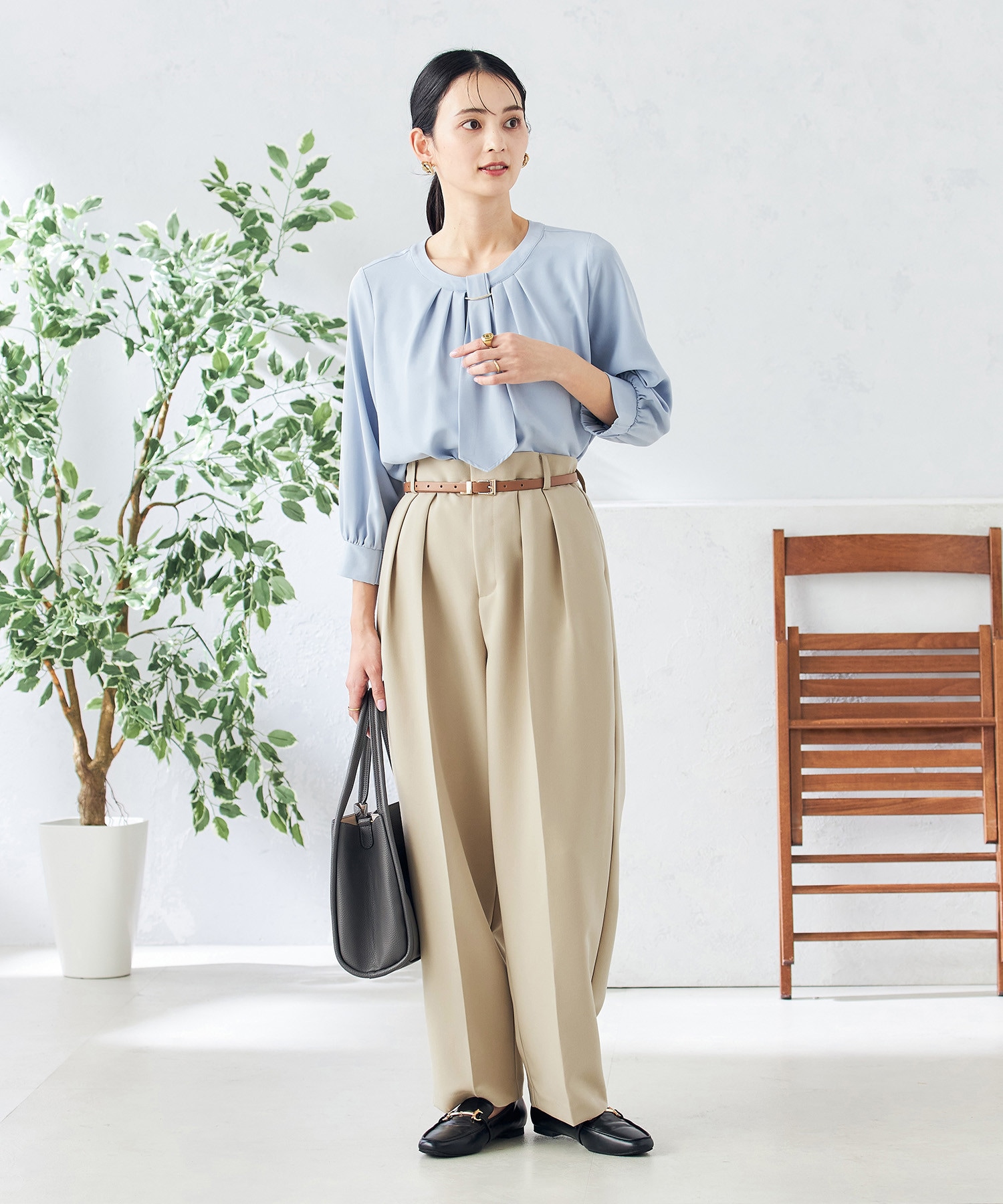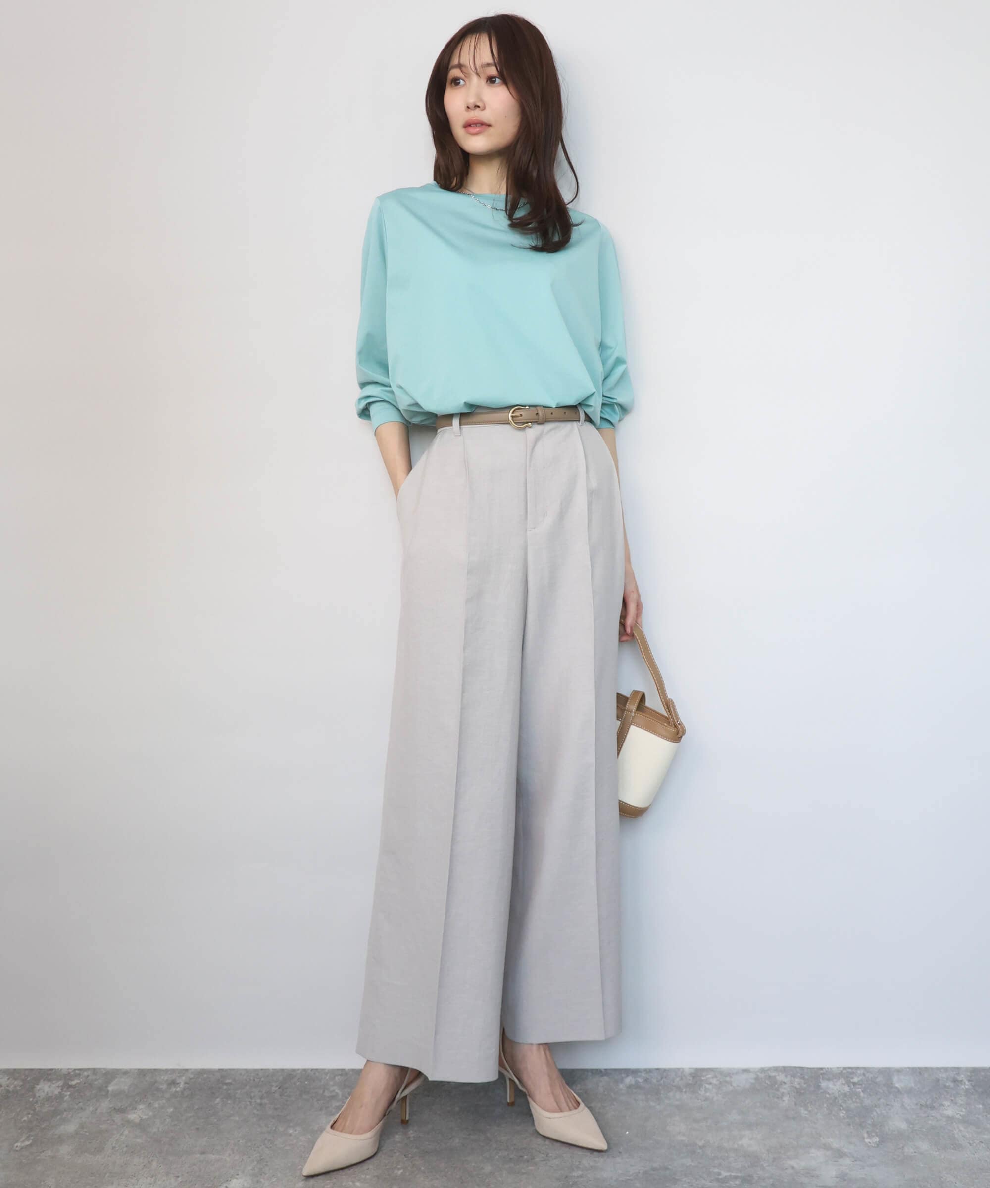 艶感カットソー×センタープレスパンツで、リラックス感と上品さを両立。接触冷感やUVカットなど機能素材で、汗ばむ季節も快適な着心地に。ショッピングなどの休日にも心地よく過ごせる、きれいめカジュアルな着こなしです。